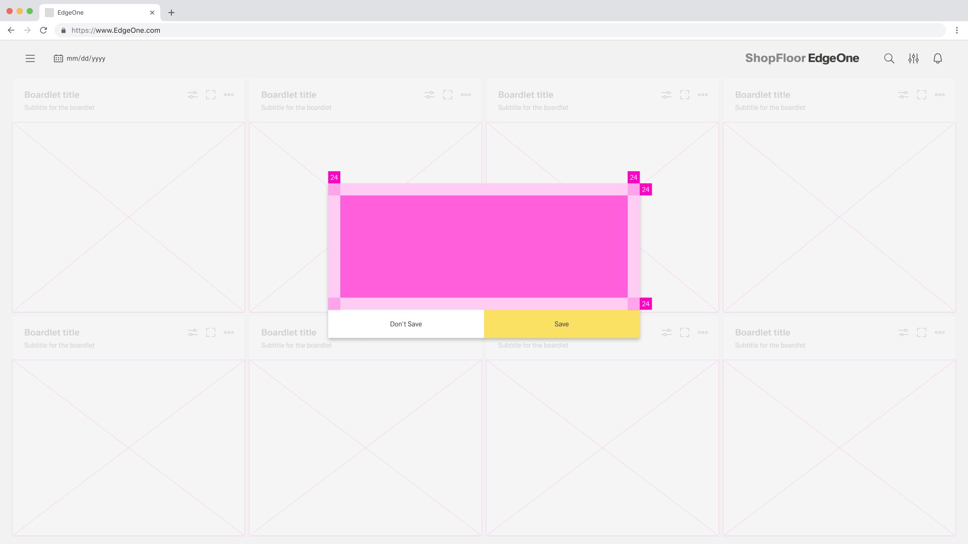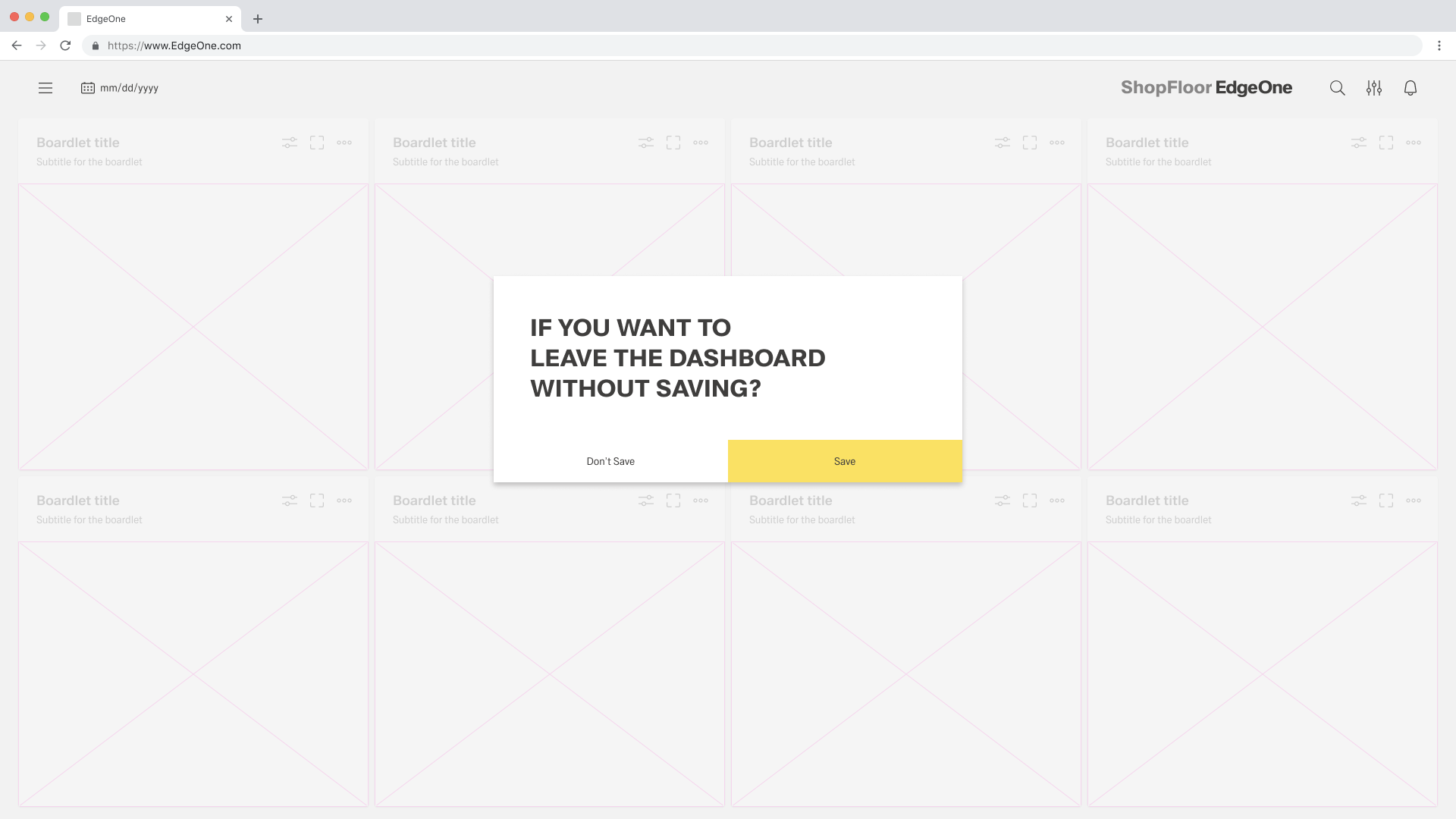 Dialogues or modules always have an overlay. The overlay has the same colour as the BG of the dashboard, but only in 70% transparency. The entire background behind the dialogue or modal is 15% blurred. The header of the dashboard is always excluded.