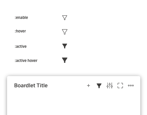 :enable ist die Standart Darstellung. :hover unterscheidet sich durch eine leichte Farbnuance und eine minimale animation. :active muss durch einen höhere Kontrast klar von den :enable oder hover unterscheiden. :active hover unterscheidet sich wie im :enable durch eine Farbnuance zum :active. :disable wird immer ohne Extension, drei Farbnuance unter oder über dem BG angezeigt.
