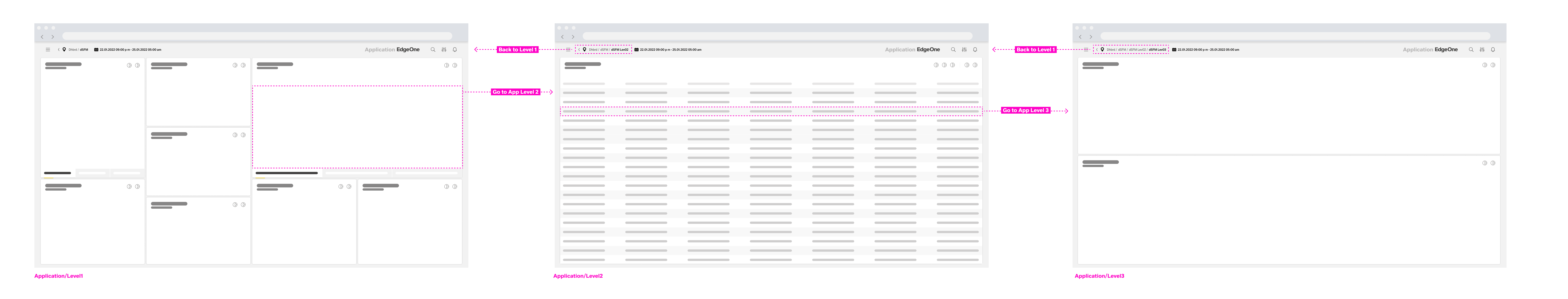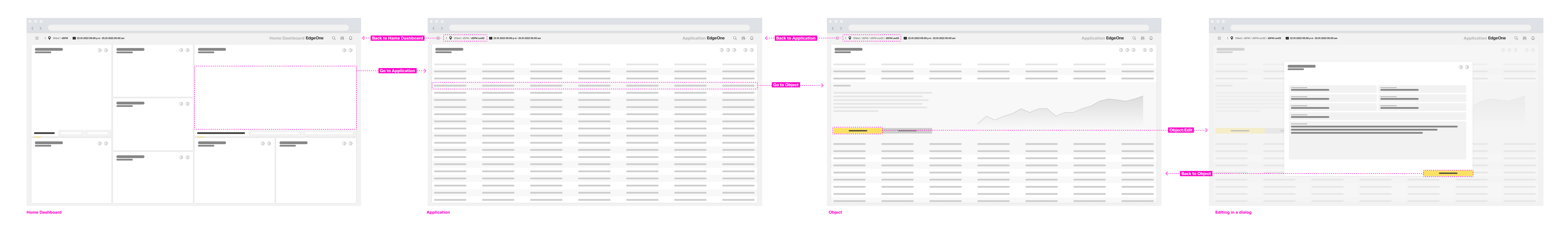 EdgeOne Inspire combines the hub-and-spoke navigation model with an application network model. A central dashboard in UPW (unified production workplace) is the center of all navigation paths. The user starts from the home dashboard and navigates forward into the apps through multiple dashboards. Multiple apps can form a process. The ubiquitous back navigation function allows the user to go back to the previous dashboard. The user can always navigate back to the home dashboard via logo.