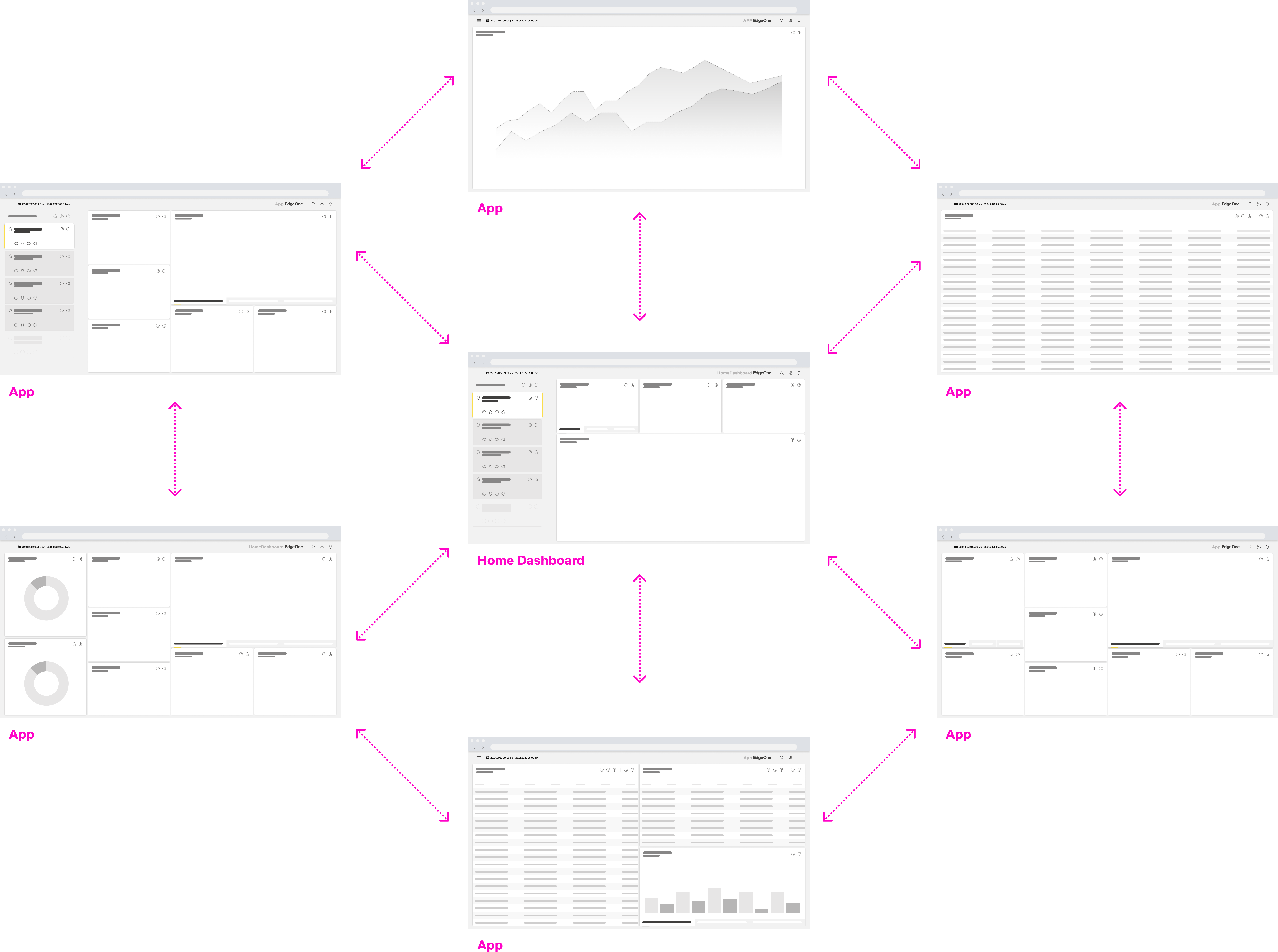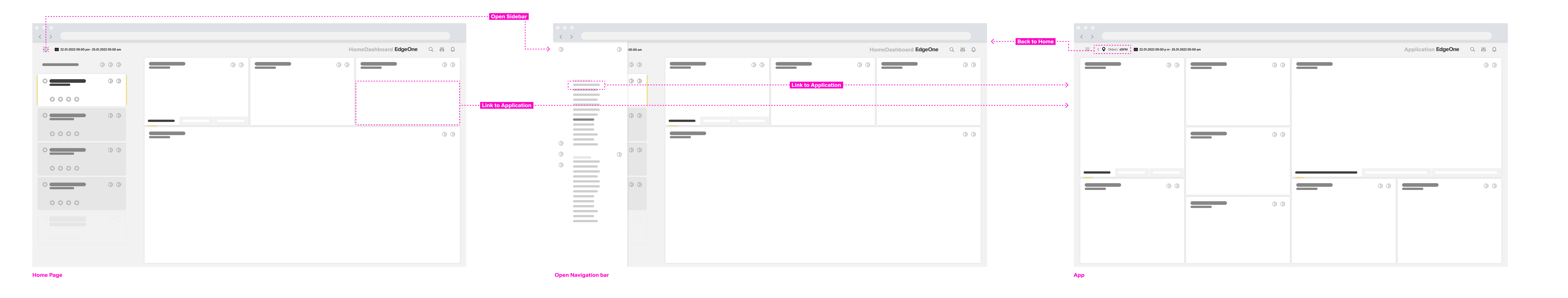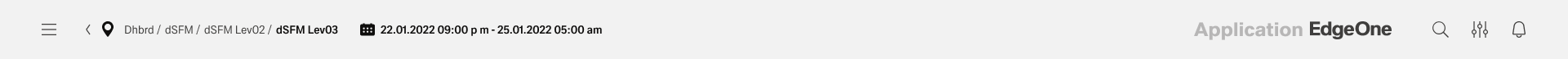 The cards (insert link) on the home dashboard represent navigation anchors to the individual apps/ dashboards. By selecting a card, the user navigates to the corresponding app/ dashboard. It is also possible to integrate legacy UI technology through these cards. EdgeOne X-Series technologies open in a new tab or window (for supported desktop operating systems only).