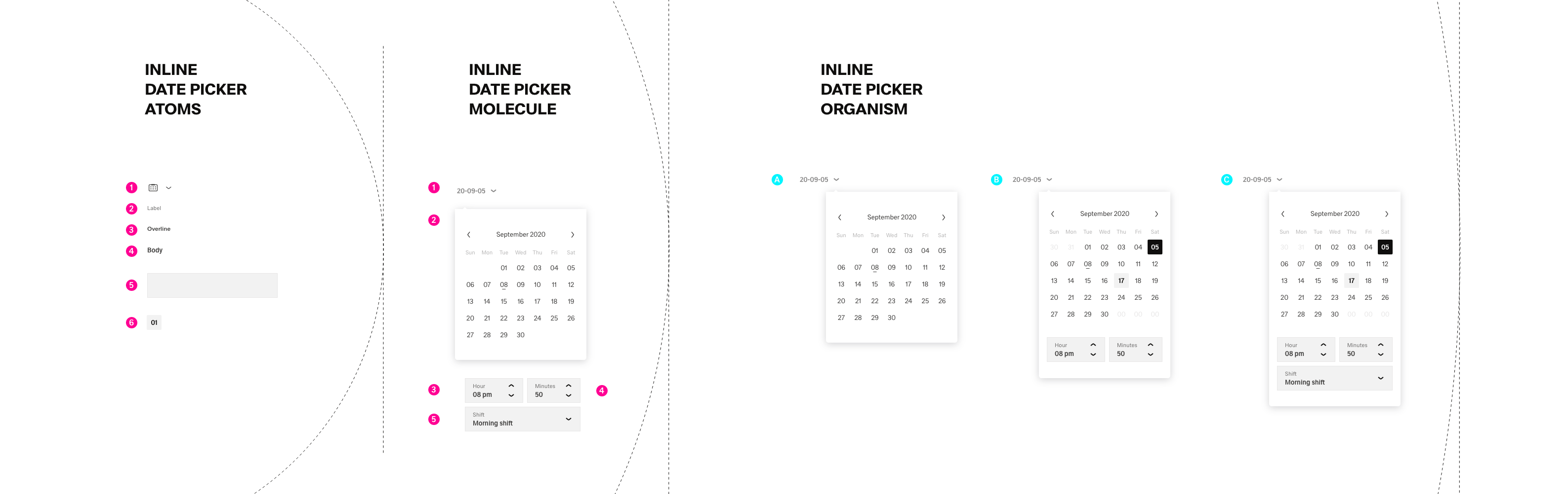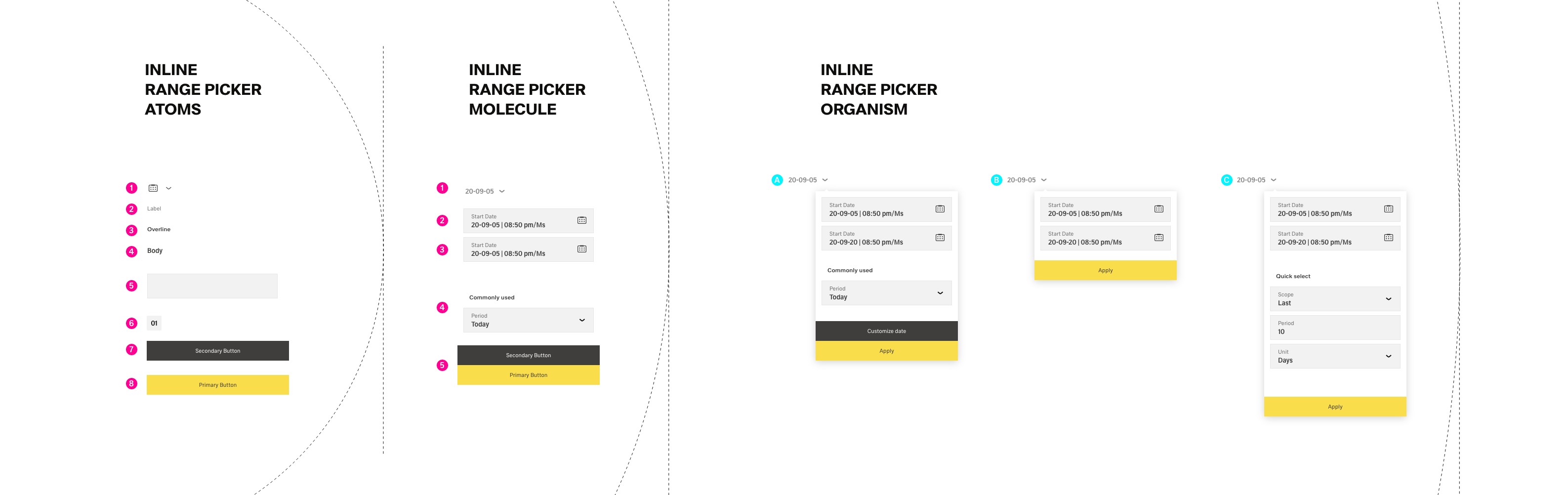 a: Datepicker (Organism) = Link w. Icon(Molecule) +/- Dropdown +/- Button(Atom)