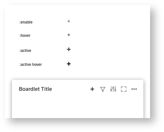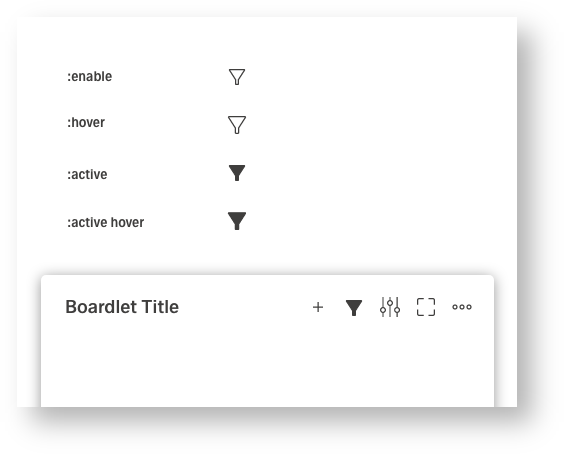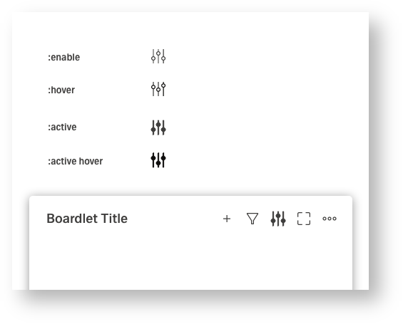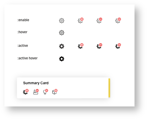 :enable is the default display. :hover differs by a slight color nuance and a minimal animation. :active must be clearly distinguished from :enable or :hover by a higher contrast. :active hover differs from the :active by a color nuance, as in :enable. :disable is always displayed without extension, three color nuances below or above the BG.