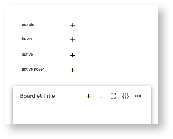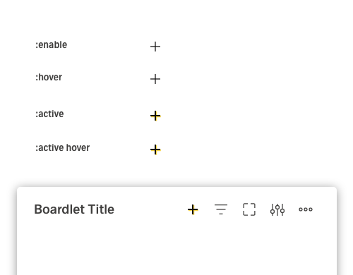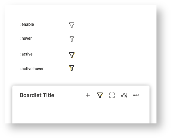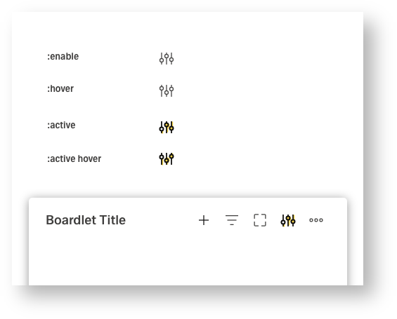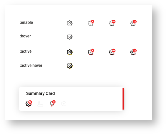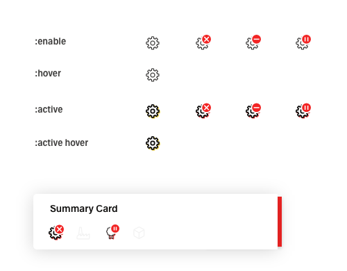:enable is the default display. :hover differs by a slight color nuance and a minimal animation. :active must be clearly distinguished from :enable or :hover by a higher contrast. :active hover differs from the :active by a color nuance, as in :enable. :disable is always displayed without extension, three color nuances below or above the BG.