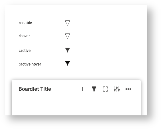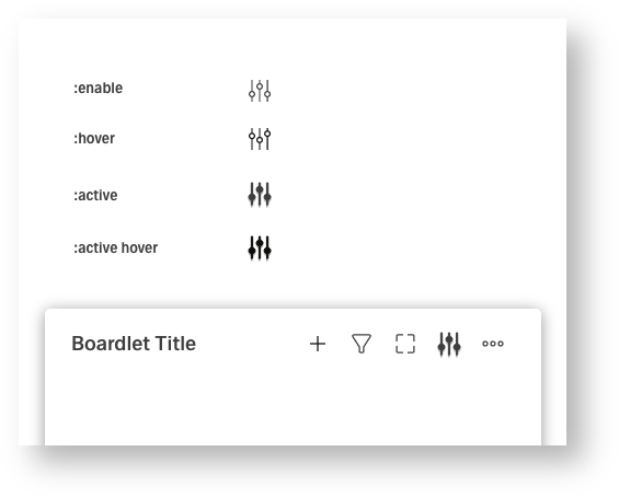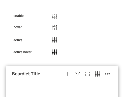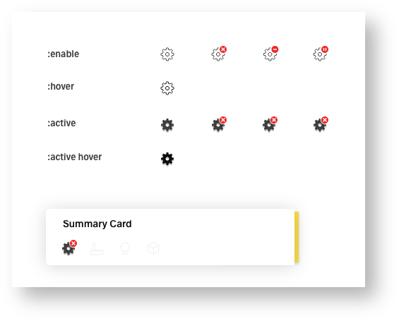 :enable is the default display. :hover differs by a slight color nuance and a minimal animation. :active must be clearly distinguished from :enable or :hover by a higher contrast. :active hover differs from the :active by a color nuance, as in :enable. :disable is always displayed without extension, three color nuances below or above the BG.