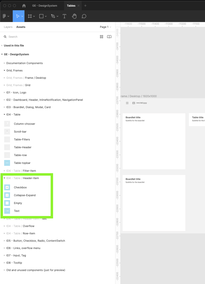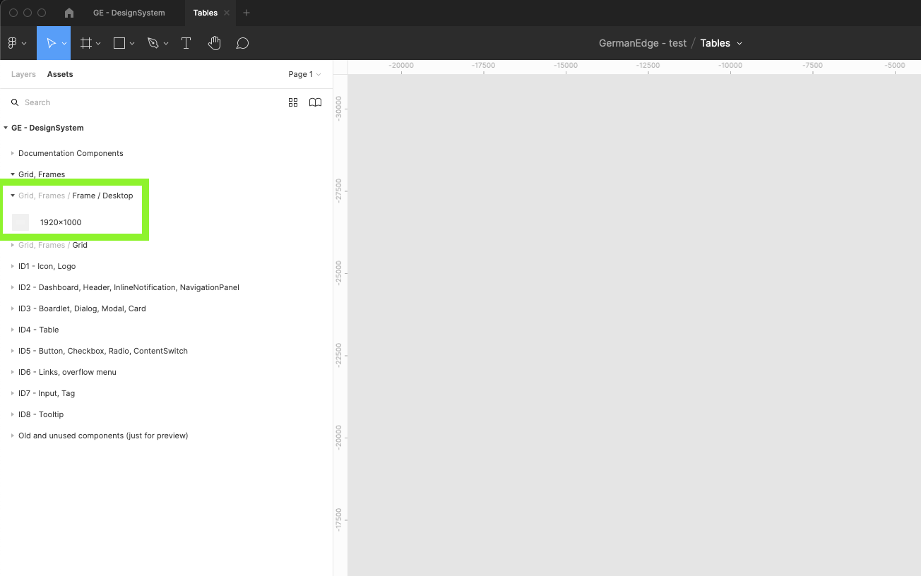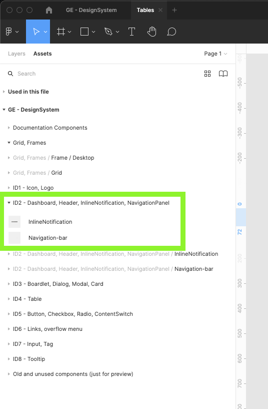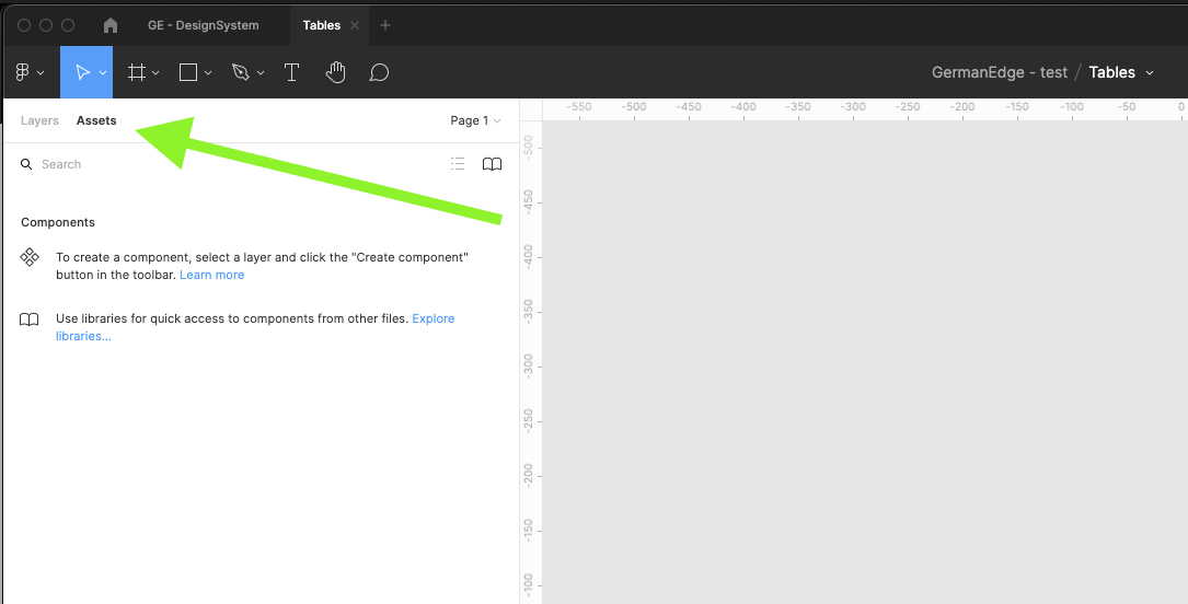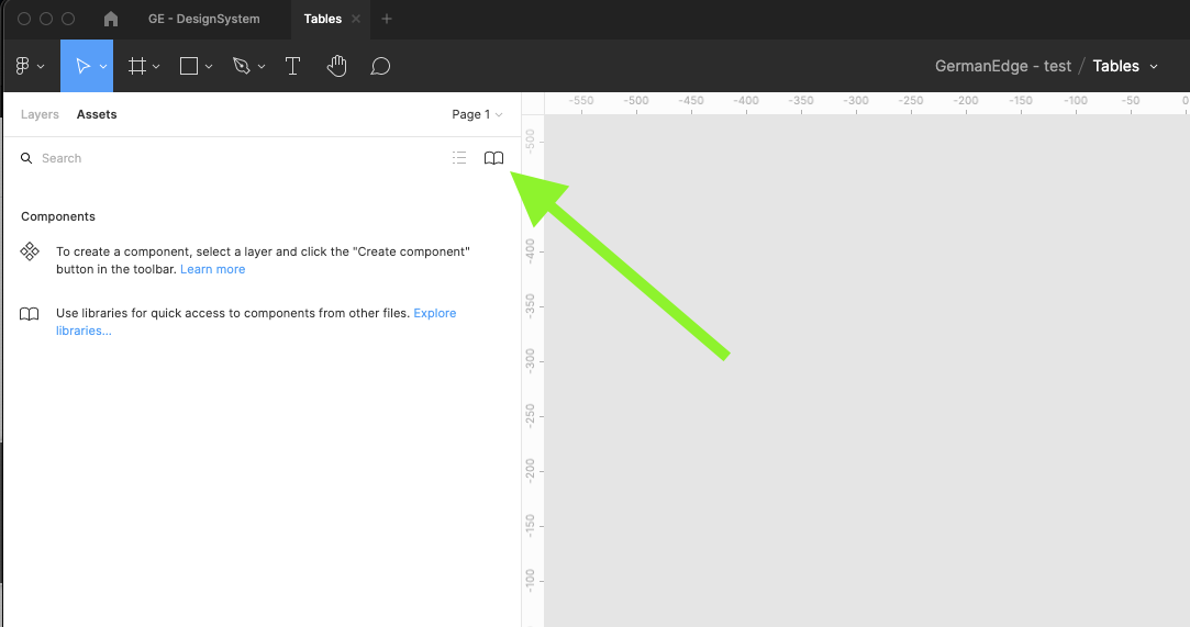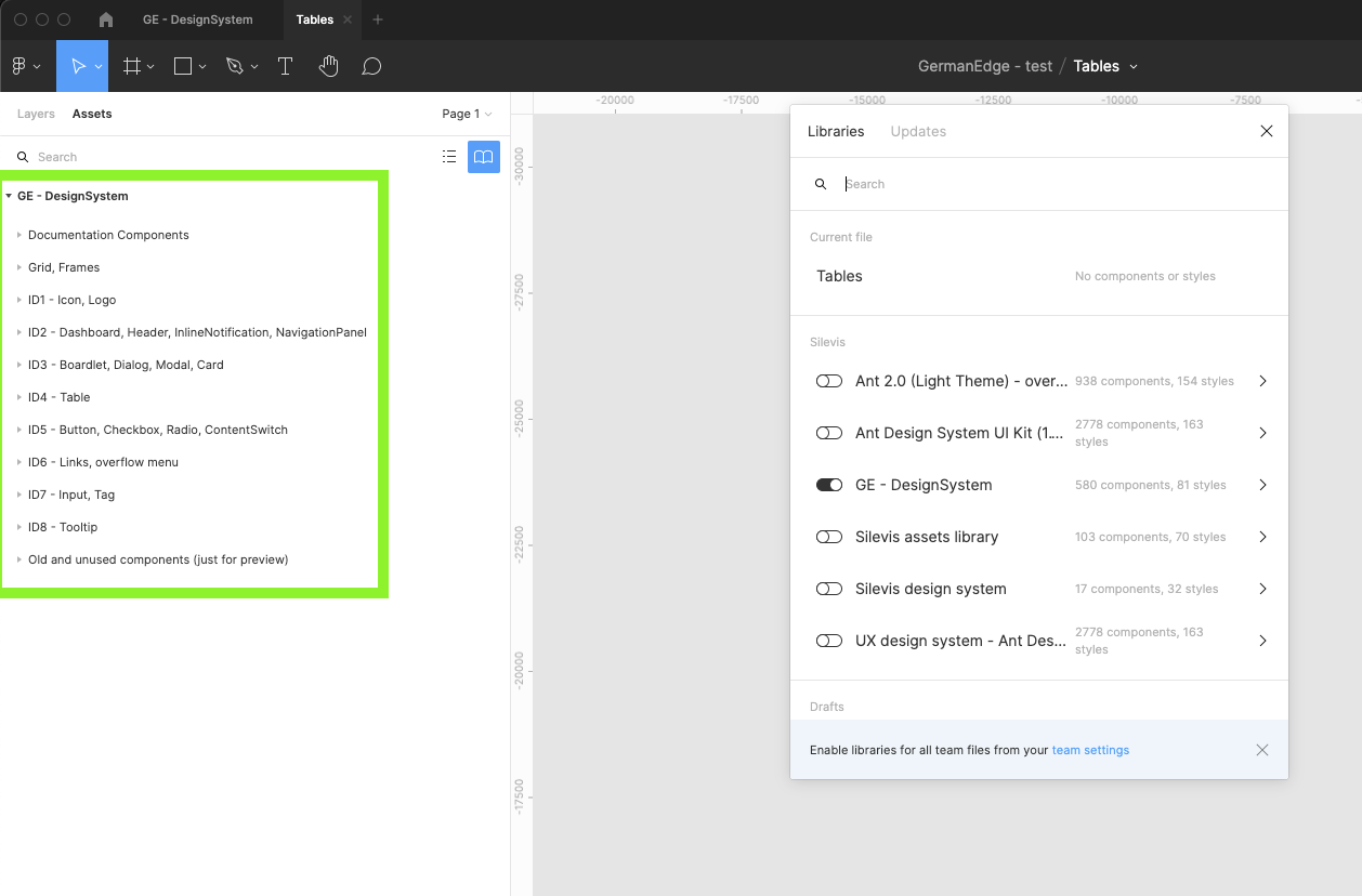 | 6 | Find the GE - Design system library and turn it on. Wait till figma loads all components categorized into different groups. Close the modal. | ||