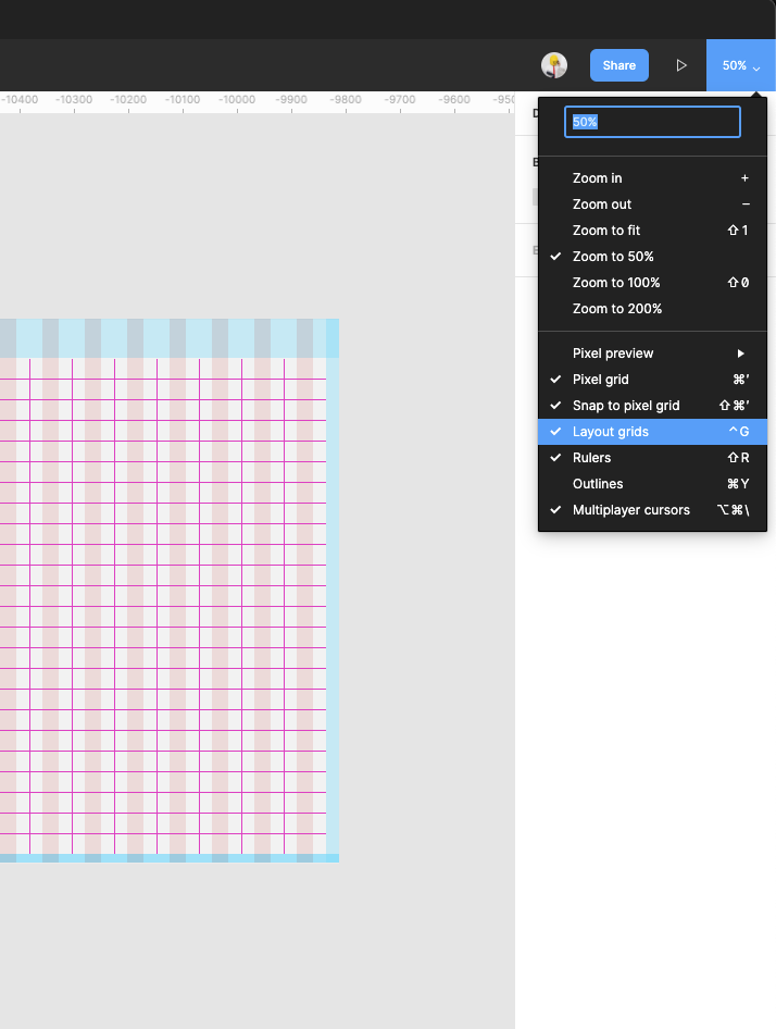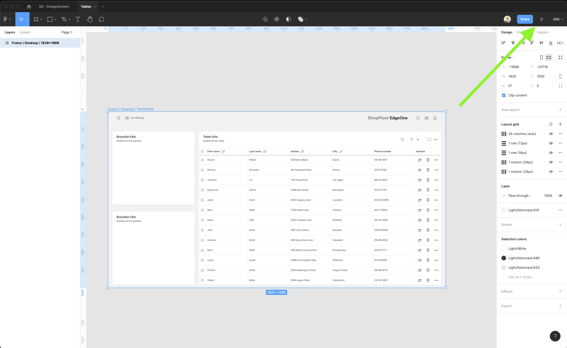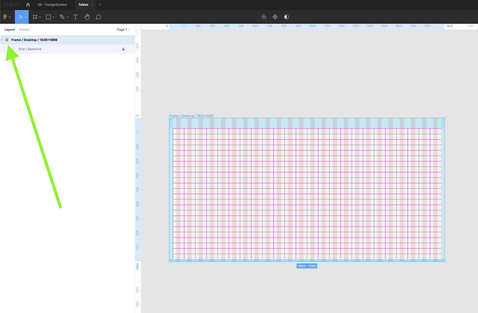 | 7 | Under Grid, Frames category find the basic Frame for Desktop window 1920x1000px. Drag and drop this component into your artboard. Make sure that in View options you have selected Layout Grids | Select Layout grid if you cannot see any grids inside the frame. | |