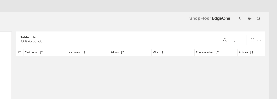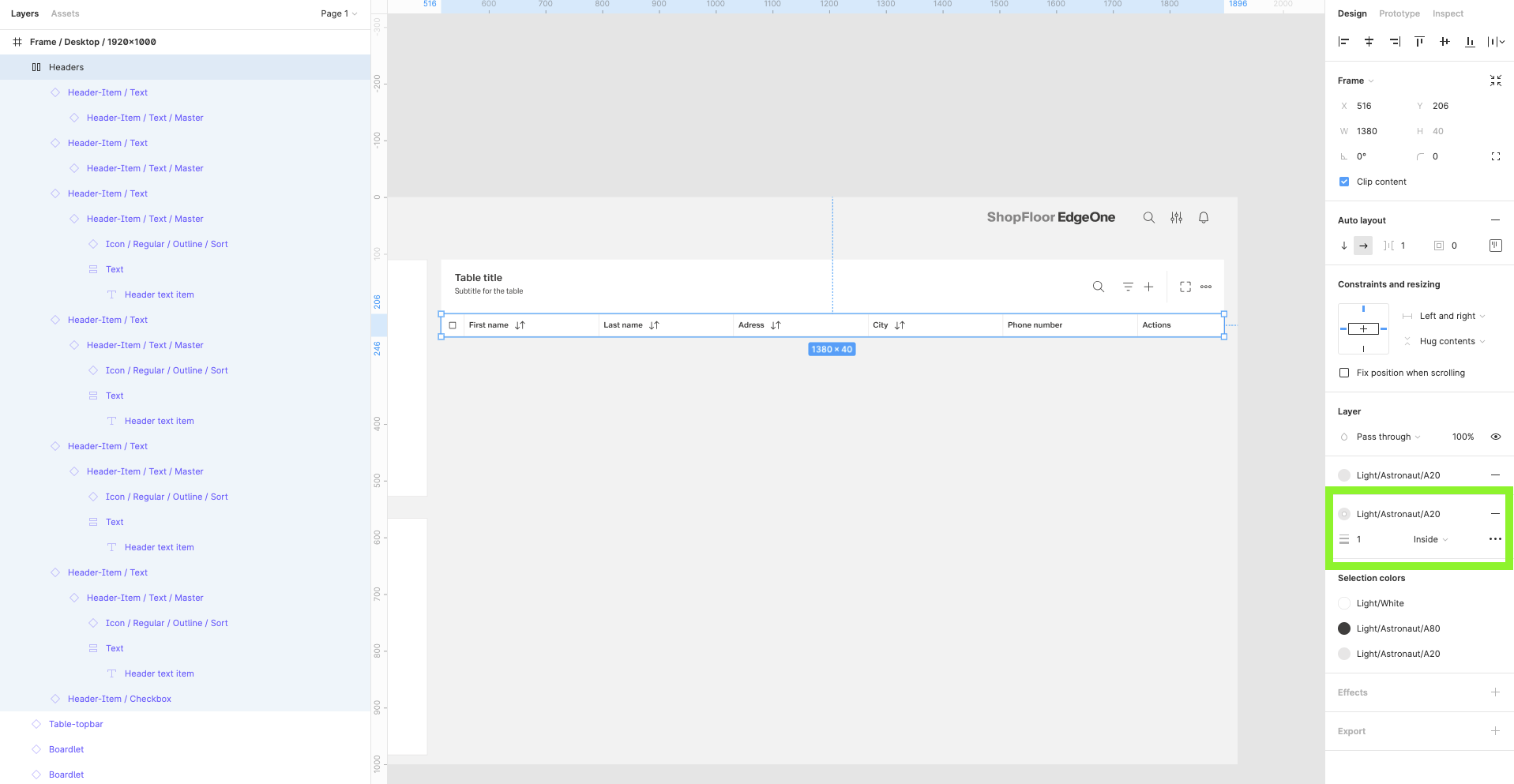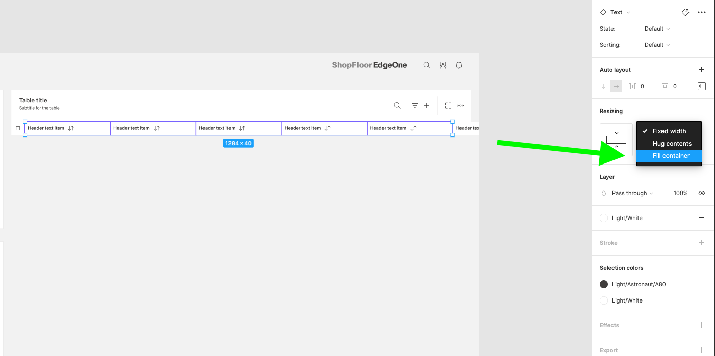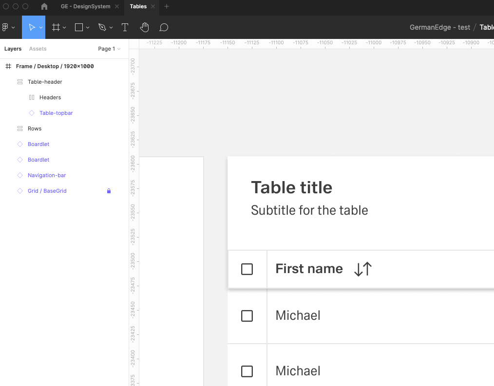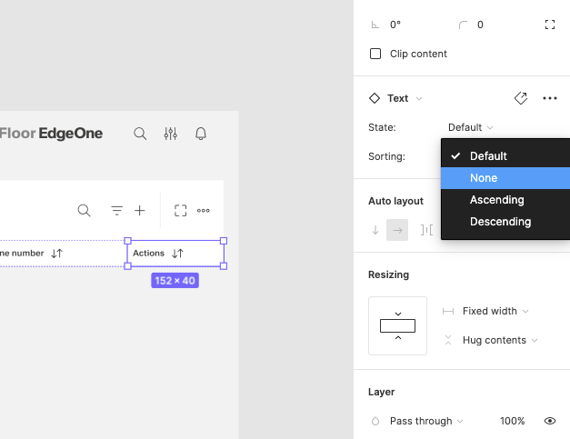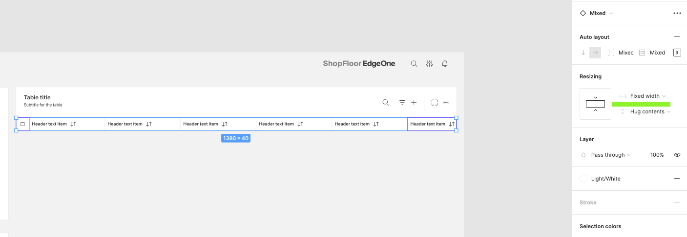| 14 | Add the header items. Select from the components which one you prefer. Place it, then select them all and group them. Adjust the Auto layout feature, add 1px spacing, select the background fill to create the dividers. Select which header-items should have a fluid width, and which one should have a fixed width (according to the documentation). Rename the text labels inside the header-items. Choose which column should be sortable and which one not. Add the 1px border around all header items. | ||
