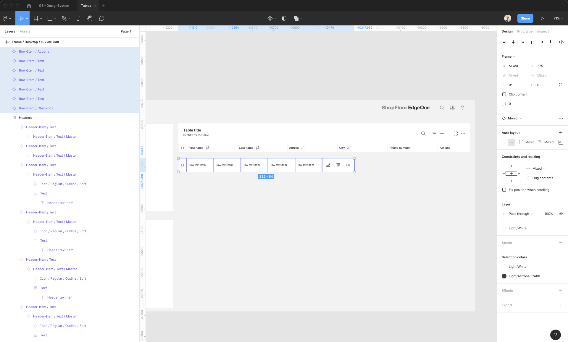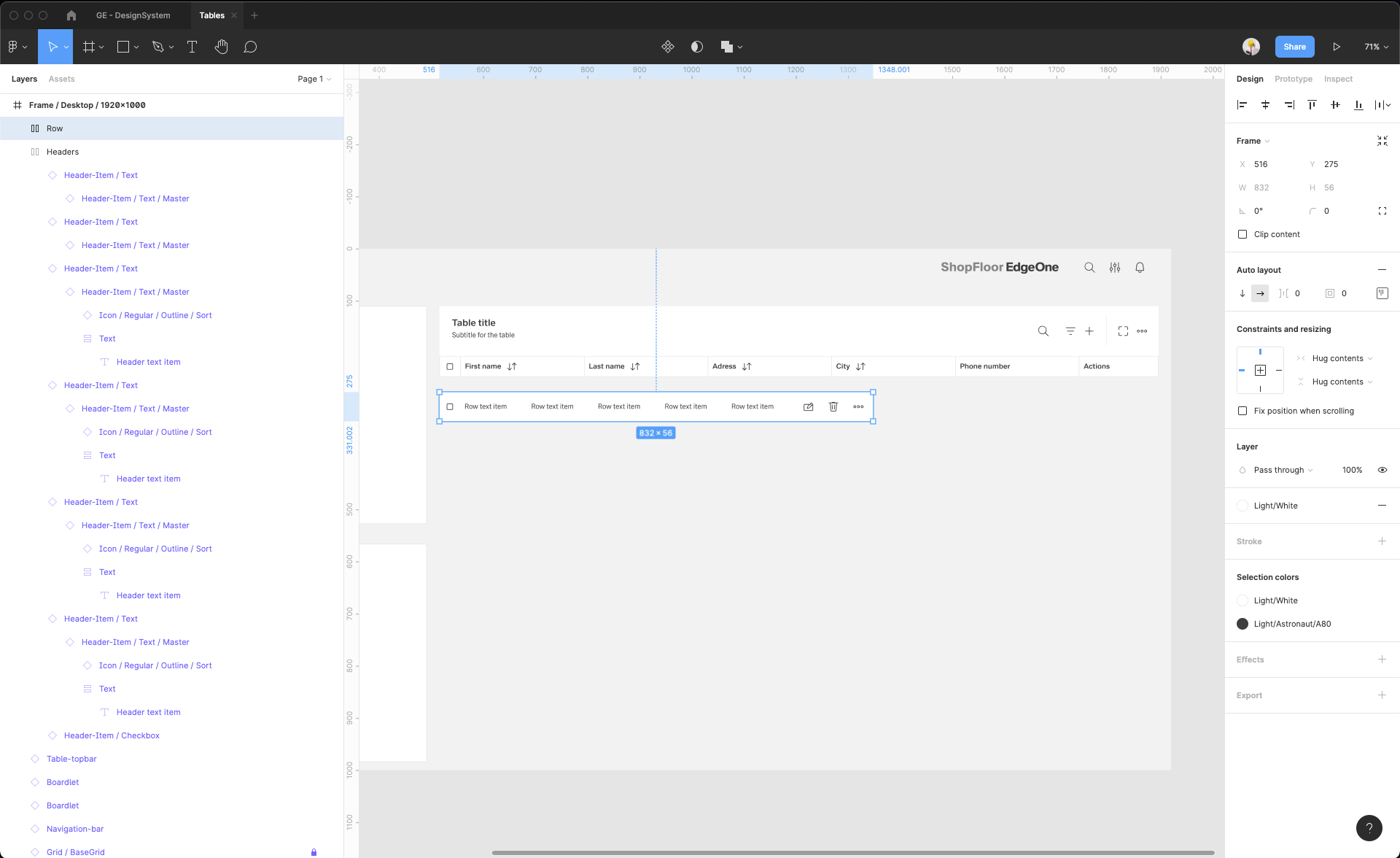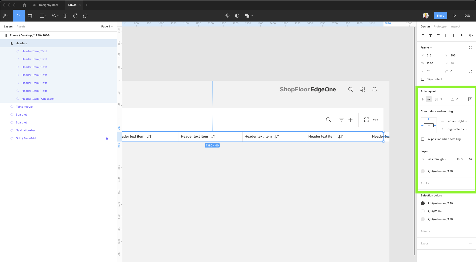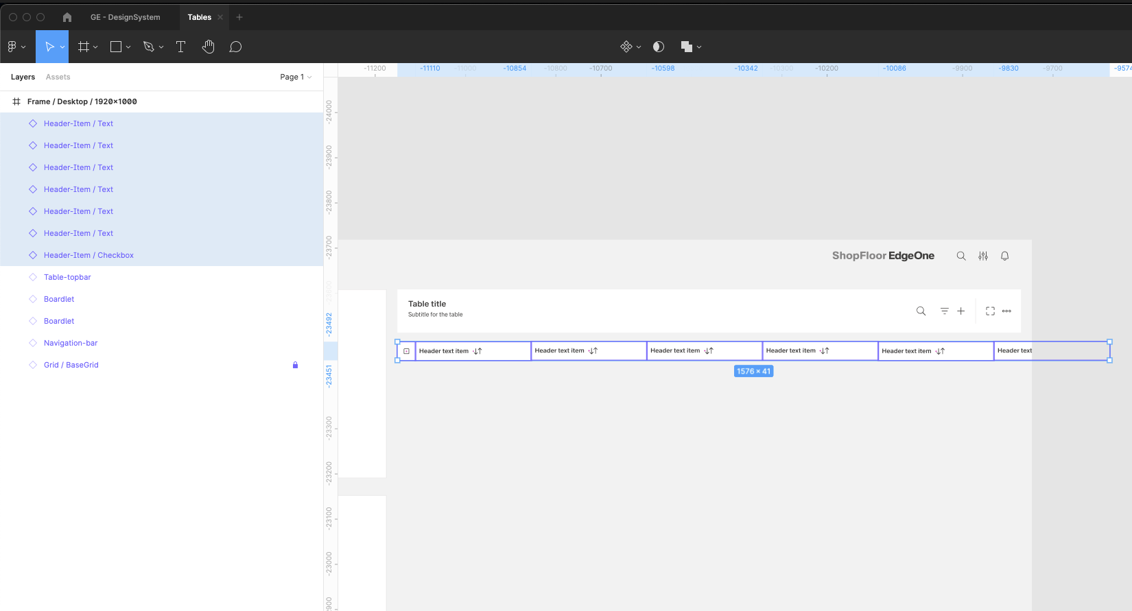 | 14 | Add the header items. Select from the components which one you prefer. Place it, then select them all and group them. Adjust the Auto layout feature, add 1px spacing, select the background fill to create the dividers. Select which header-items should have a fluid width, and which one should have a fixed width (according to the documentation). Rename the text labels inside the header-items. Choose which column should be sortable and which one not. Add the 1px border around all header items. | ||