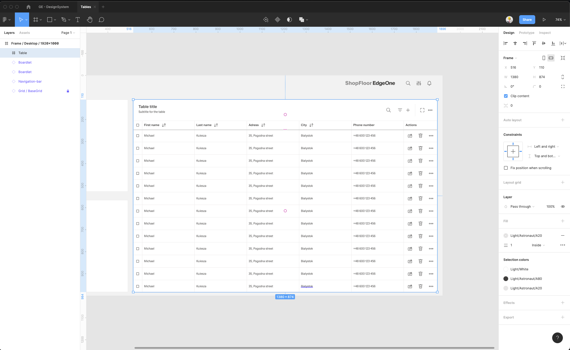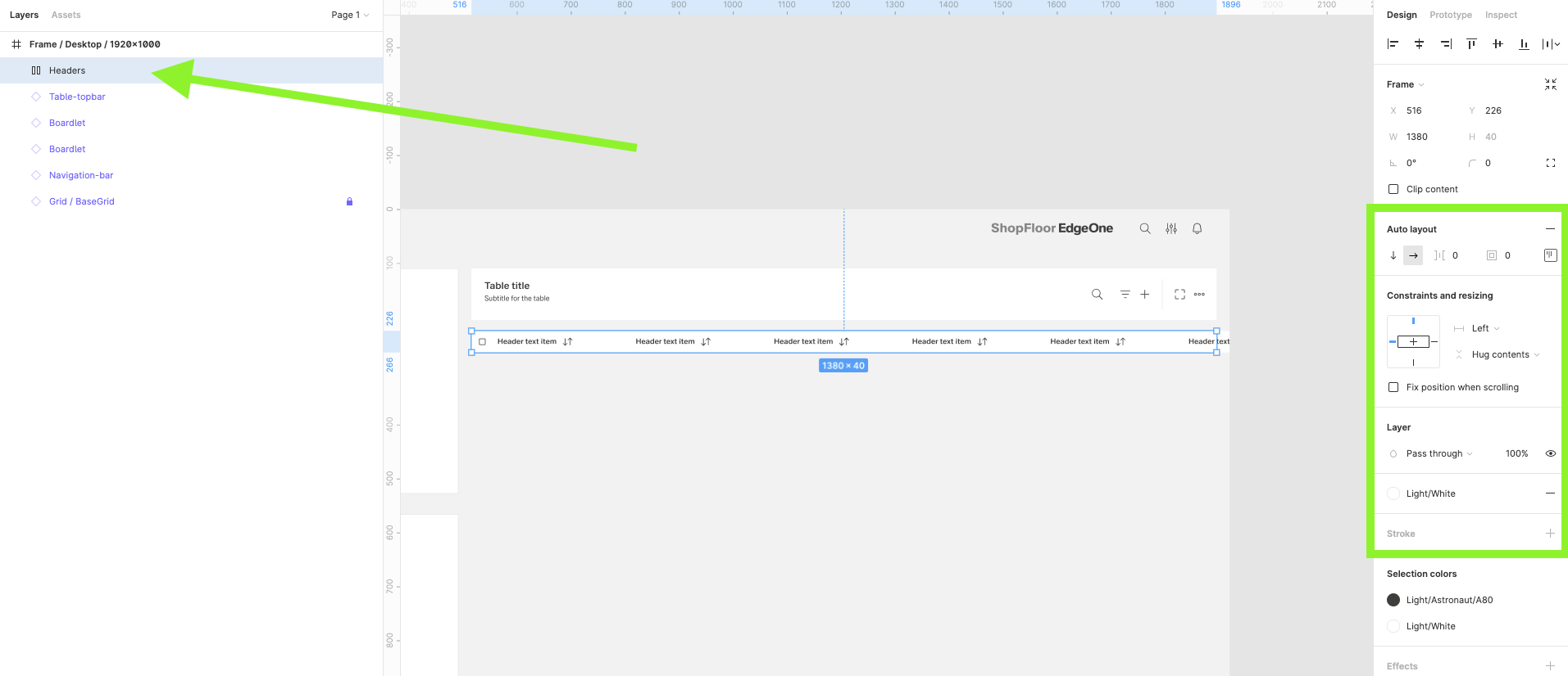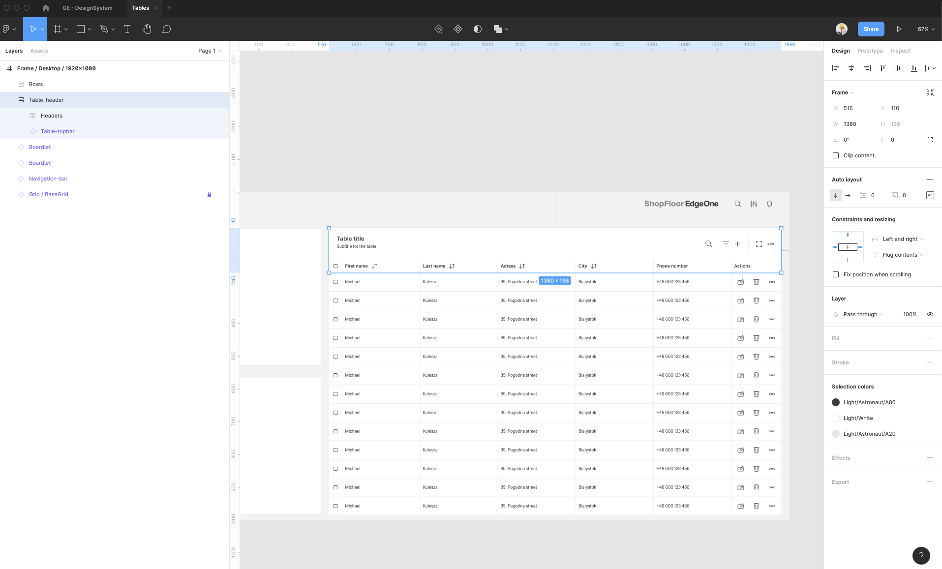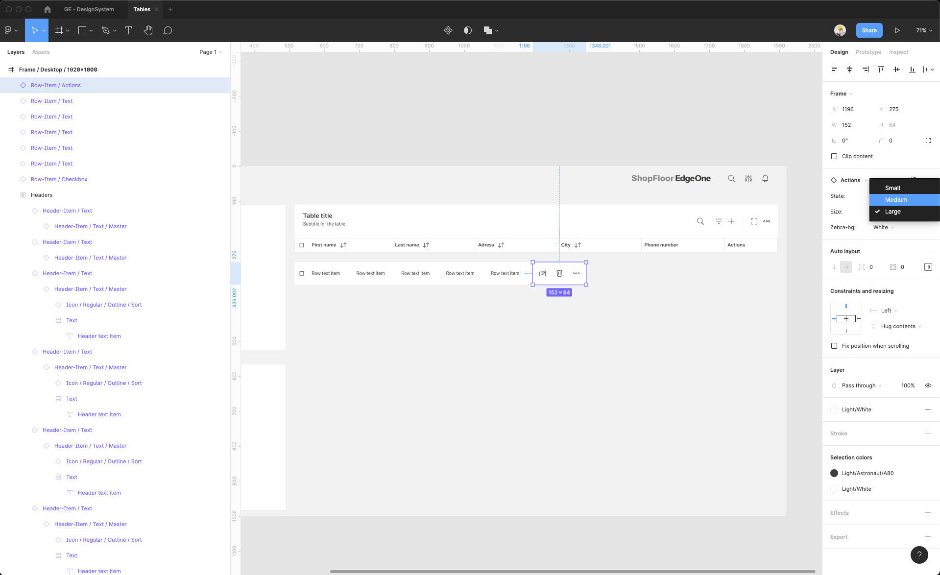| 14 | Add the header items. Select from the components which one you prefer. Place it, then select them all and group them. Adjust the Auto layout feature, add 1px spacing, select the background fill to create the dividers. Select which header-items should have a fluid width, and which one should have a fixed width (according to the documentation). Rename the text labels inside the header-items. Choose which column should be sortable and which one not. Add the 1px border around all header items. | ||