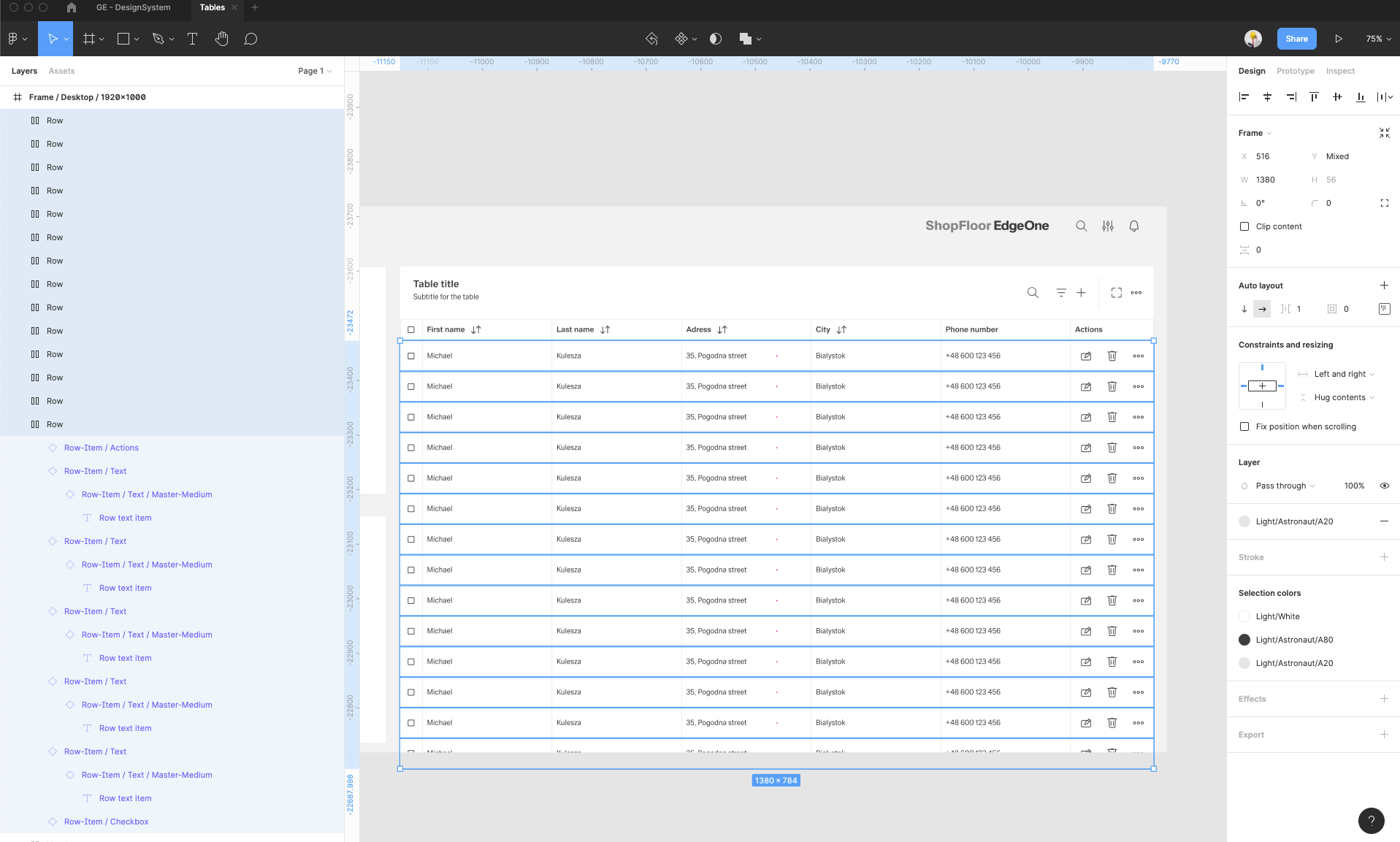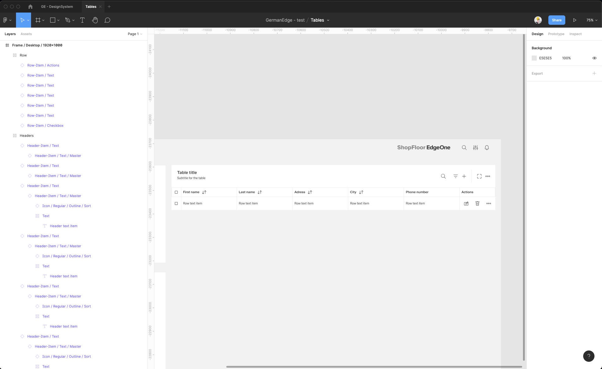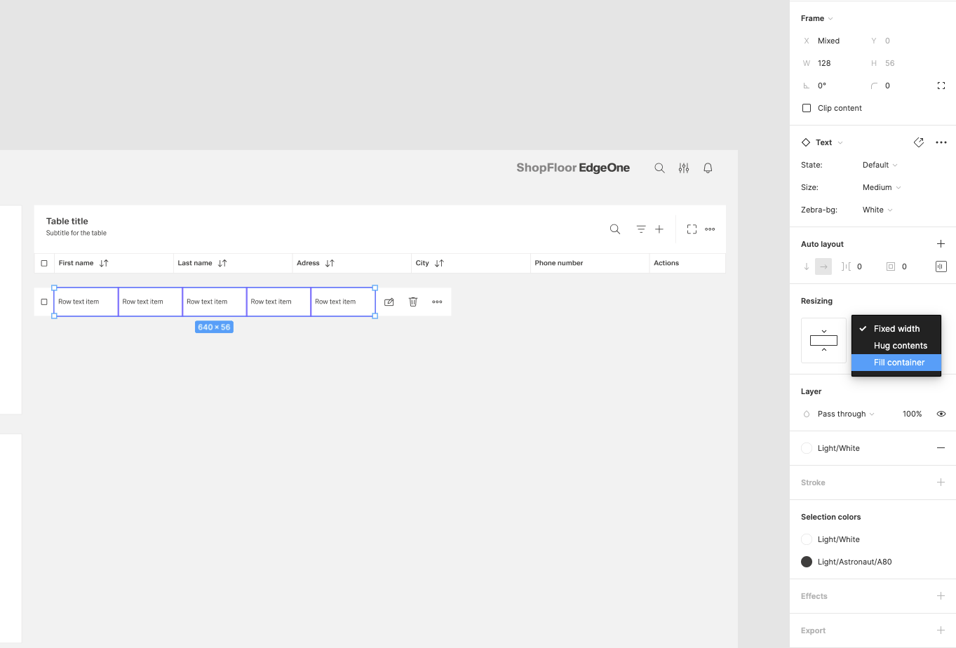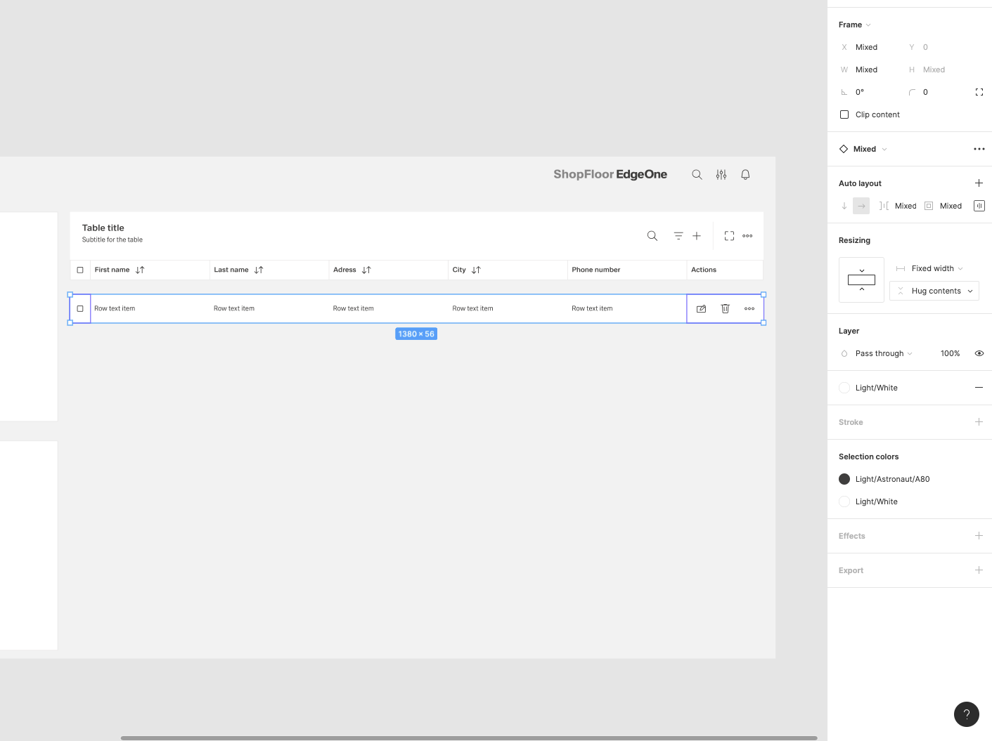 | 15 | Add the row items. Select row-items from the components to fit the header items.. Place it, change the size from Large to Medium, then select them all and group them. Adjust the Auto layout feature, add 1px spacing, select the background fill to create the dividers. Select which row-items should have a fluid width, and which one should have a fixed width (in the same way like in header-items). Rename the text labels inside the rowr-items. | ||