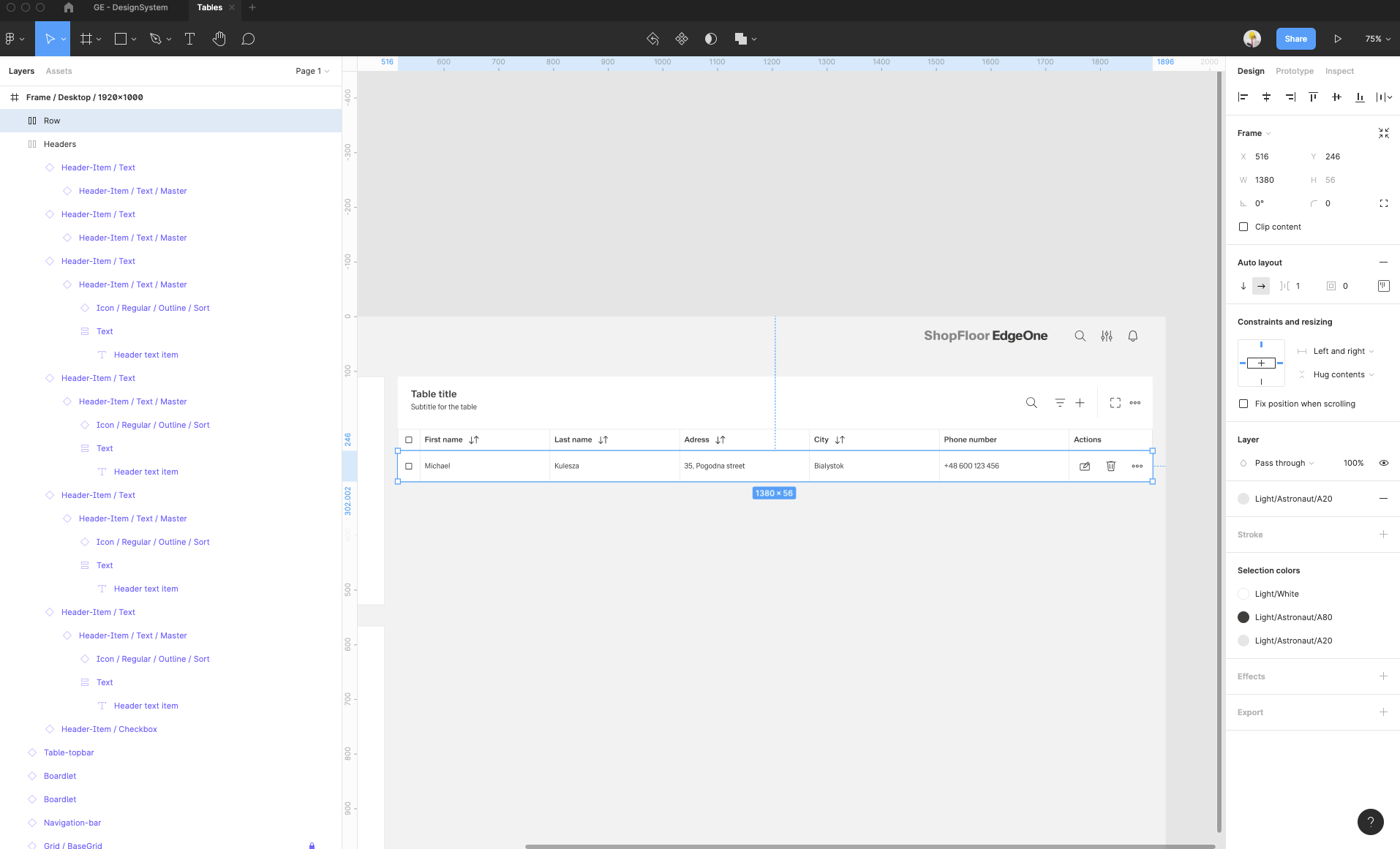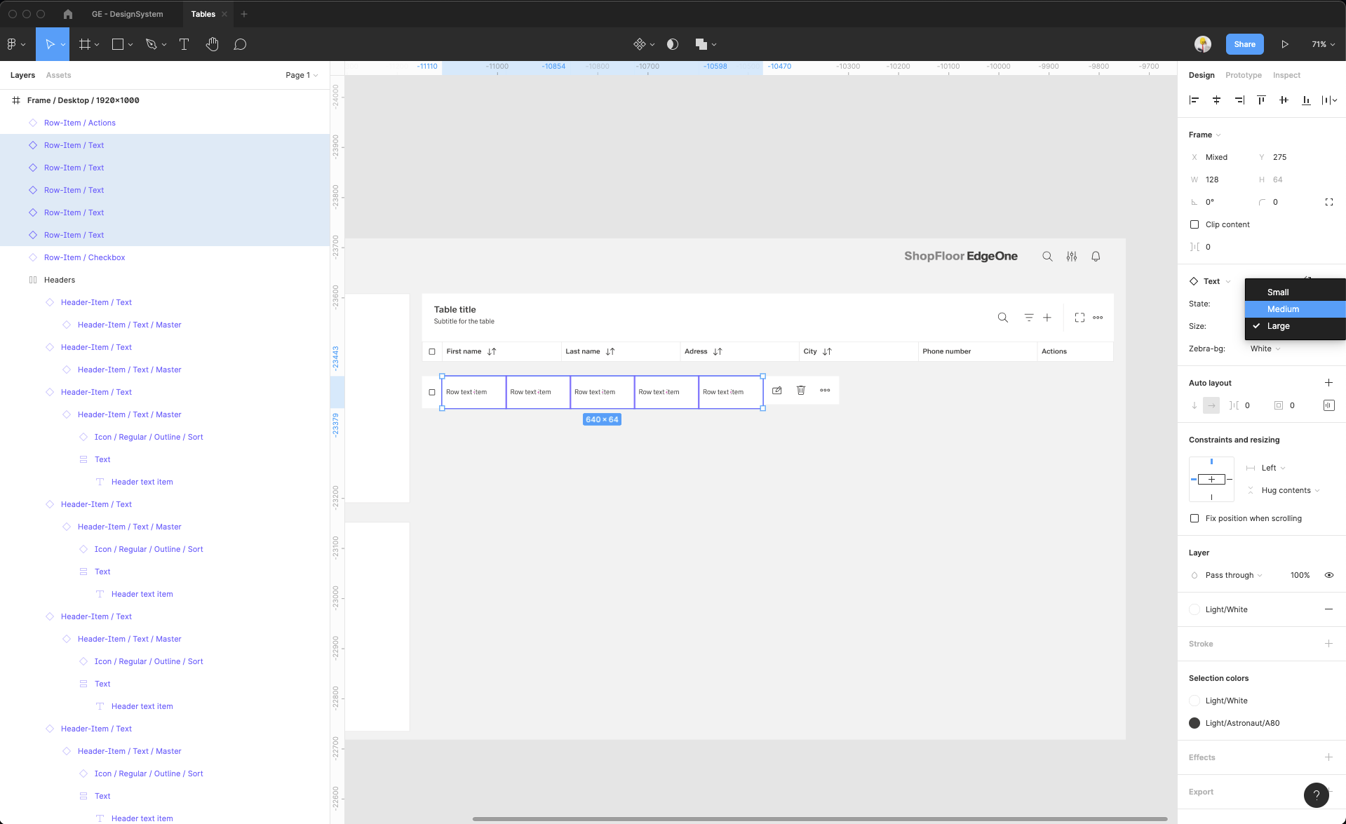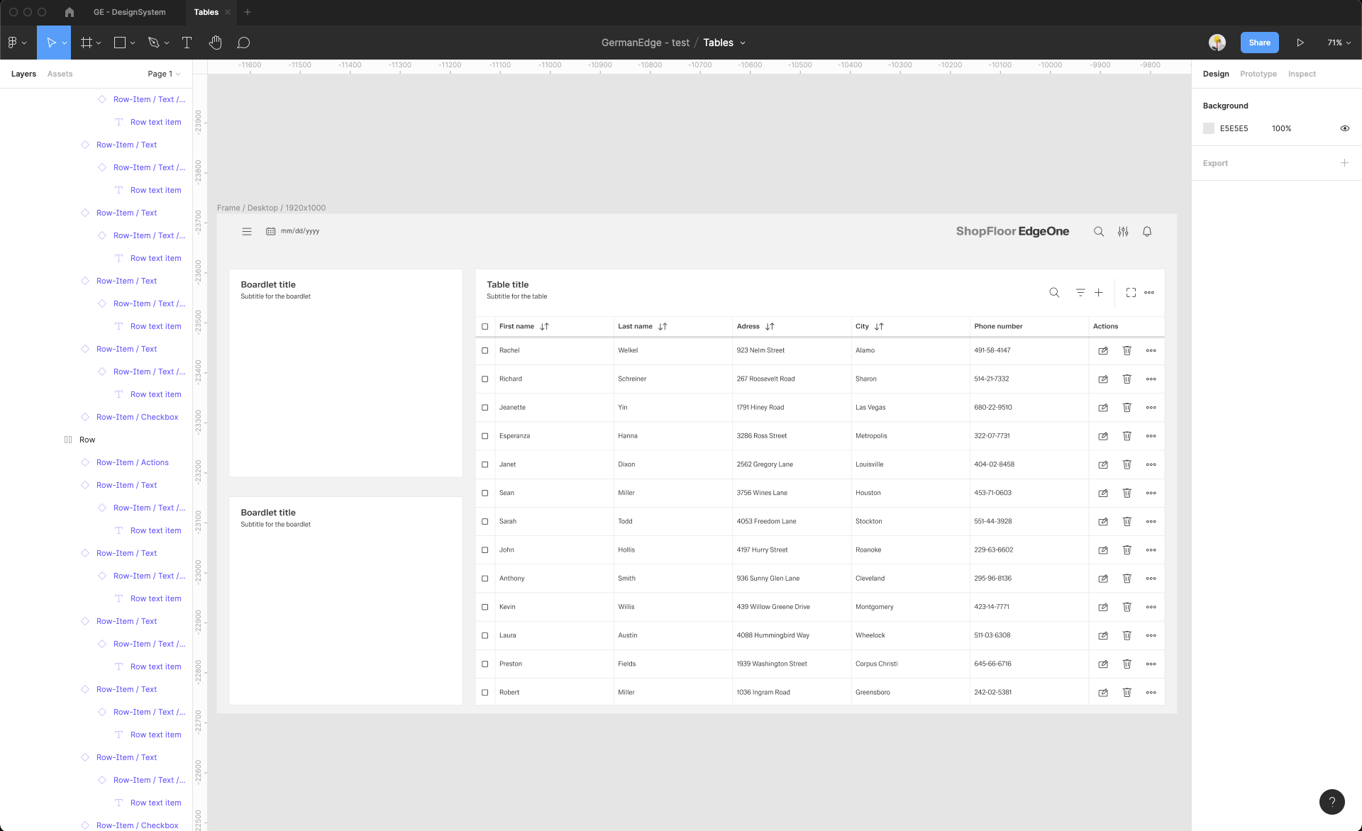 | 15 | Add the row items. Select row-items from the components to fit the header items.. Place it, change the size from Large to Medium, then select them all and group them. Adjust the Auto layout feature, add 1px spacing, select the background fill to create the dividers. Select which row-items should have a fluid width, and which one should have a fixed width (in the same way like in header-items). Rename the text labels inside the rowr-items. | ||