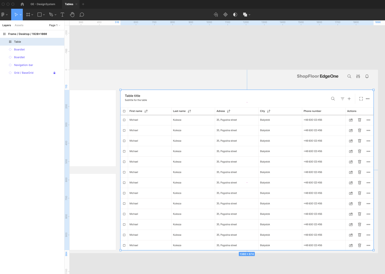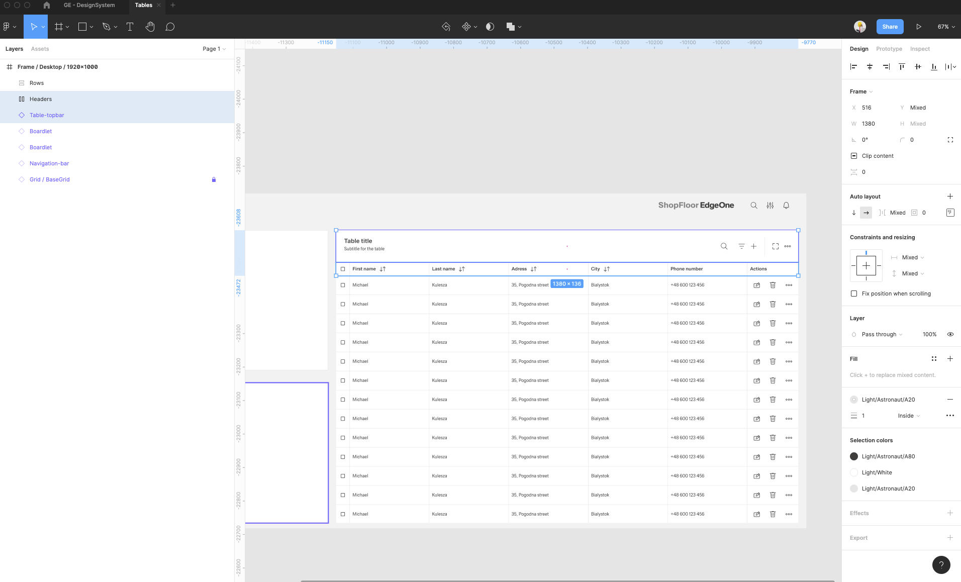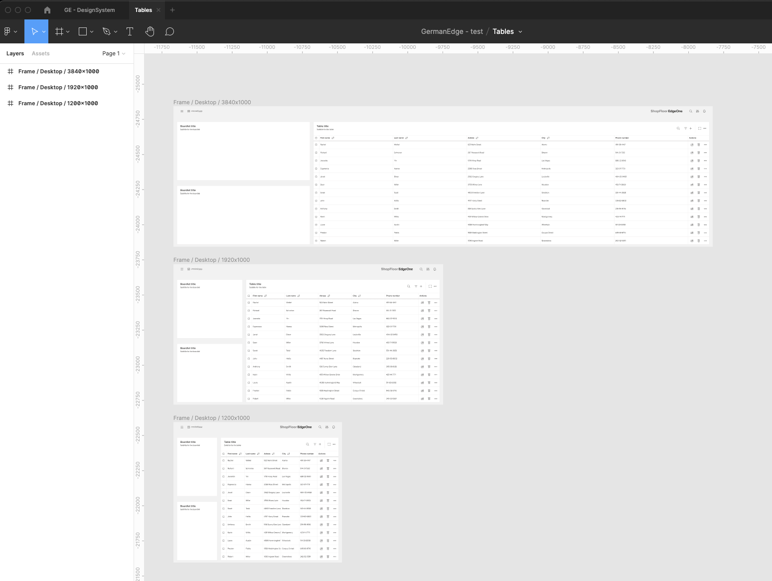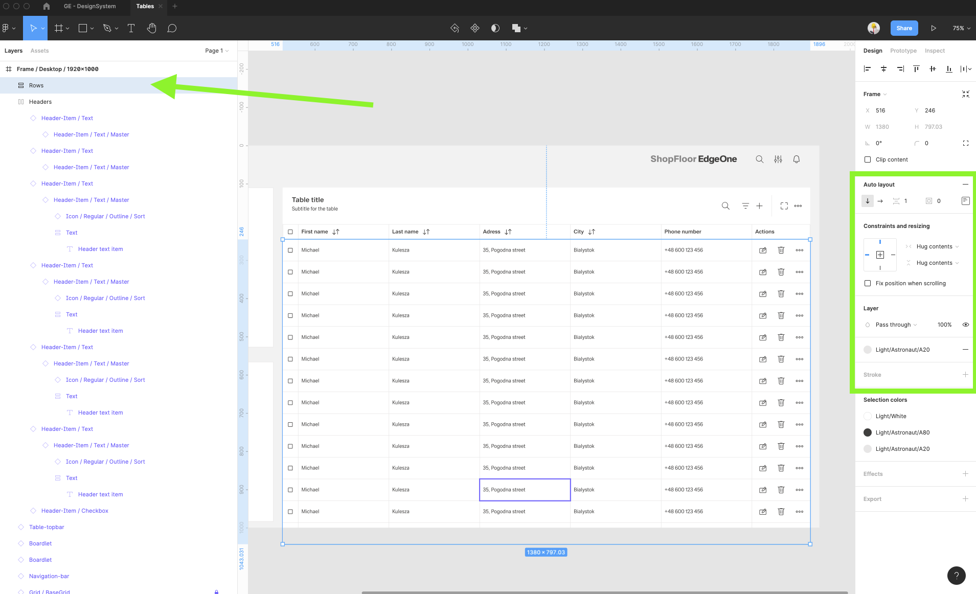 | 15 | Add the row items. Select row-items from the components to fit the header items.. Place it, change the size from Large to Medium, then select them all and group them. Adjust the Auto layout feature, add 1px spacing, select the background fill to create the dividers. Select which row-items should have a fluid width, and which one should have a fixed width (in the same way like in header-items). Rename the text labels inside the rowr-items. | ||