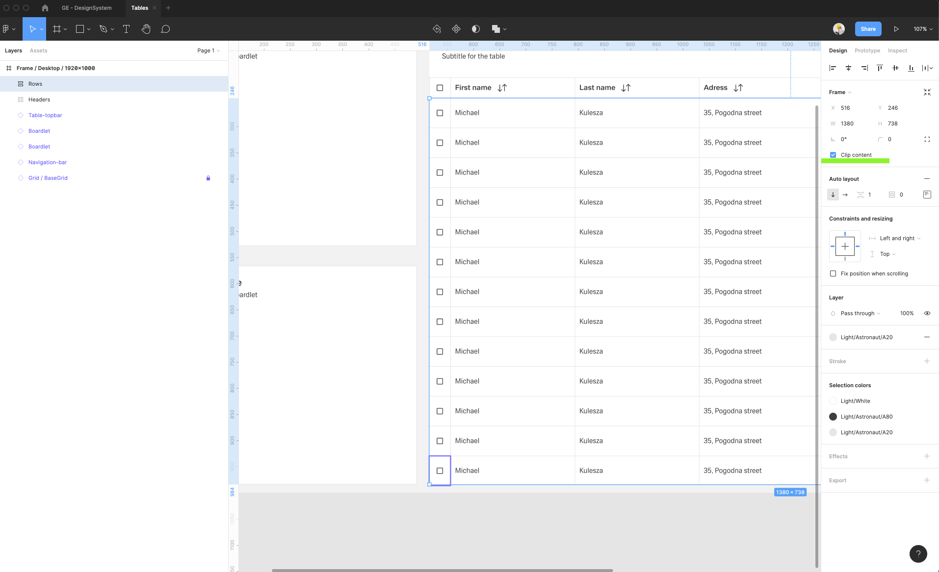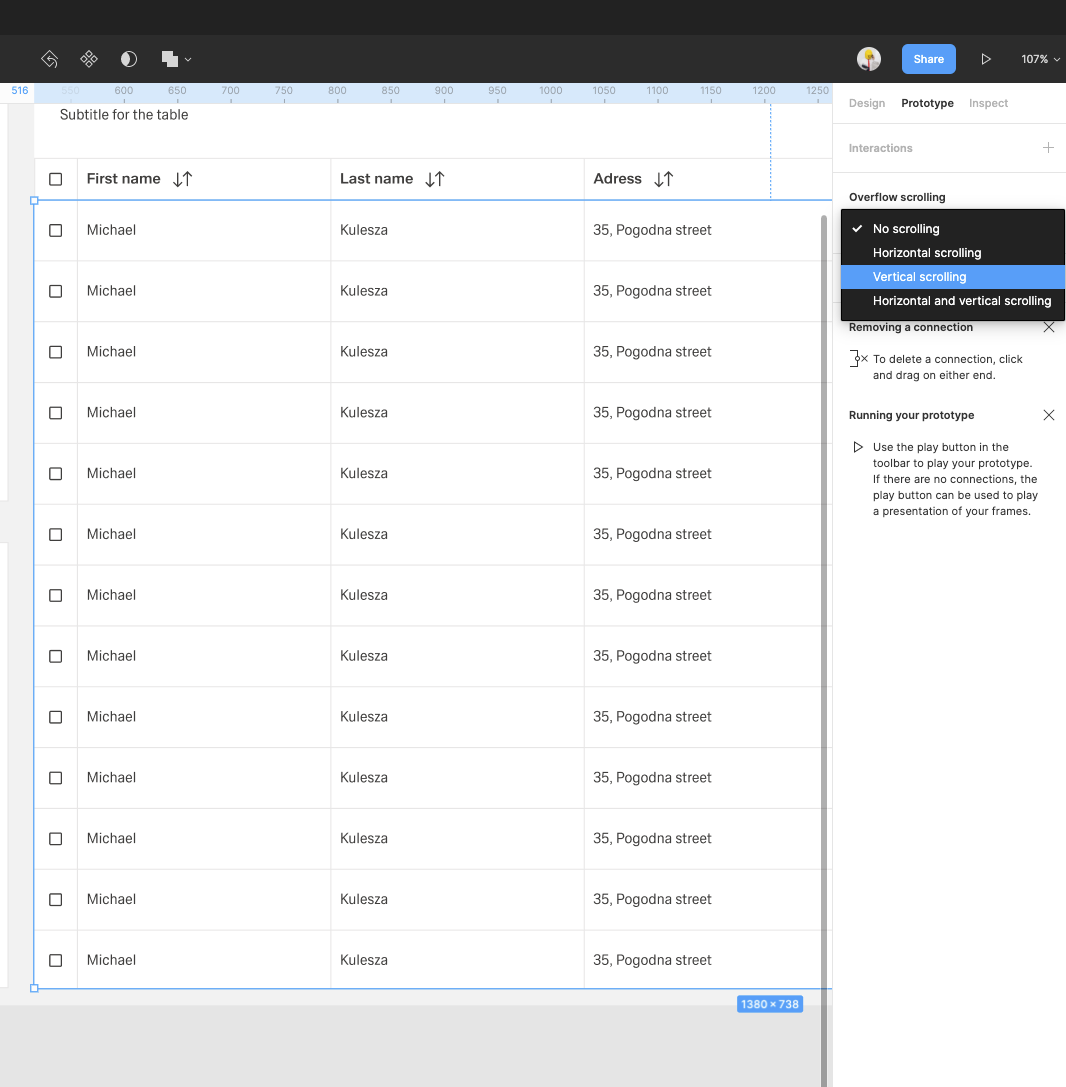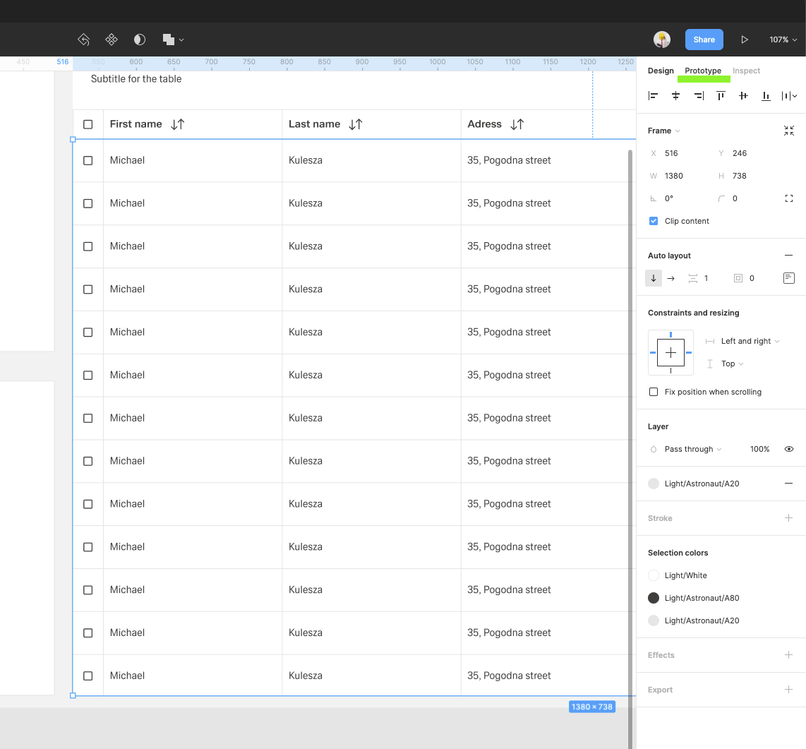 | 16 | Duplicate the row group, and group them all with auto-layout feature. Add 1px spacing between rows, add the background to create a horizontal dividers between the rows. Crop the rows group (add clip content option) to close the rows inside the screen layout. On the right sidebar switch from the Design tab to Prototype tab and Add a vertical scrolling. | ||