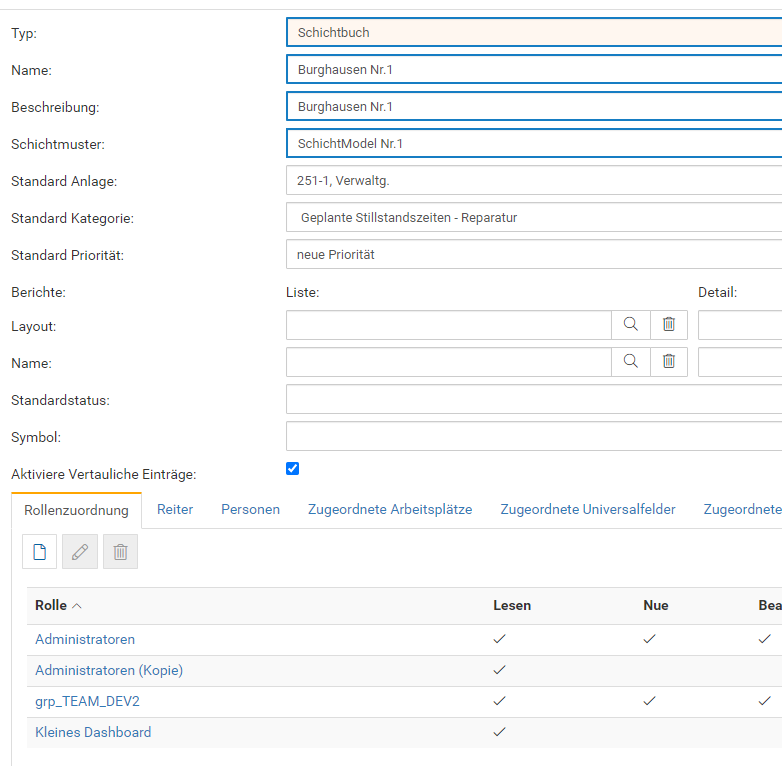 - Neuer Reiter "Rolle" in Schichtbuchdefinitionen. Nun können Sie direkt im Schichtbuch, entsprechende Rollen und Berechtigungen pflegen und müssen dies nicht mehr über die Rollen machen (Scrennshot siehe unten)