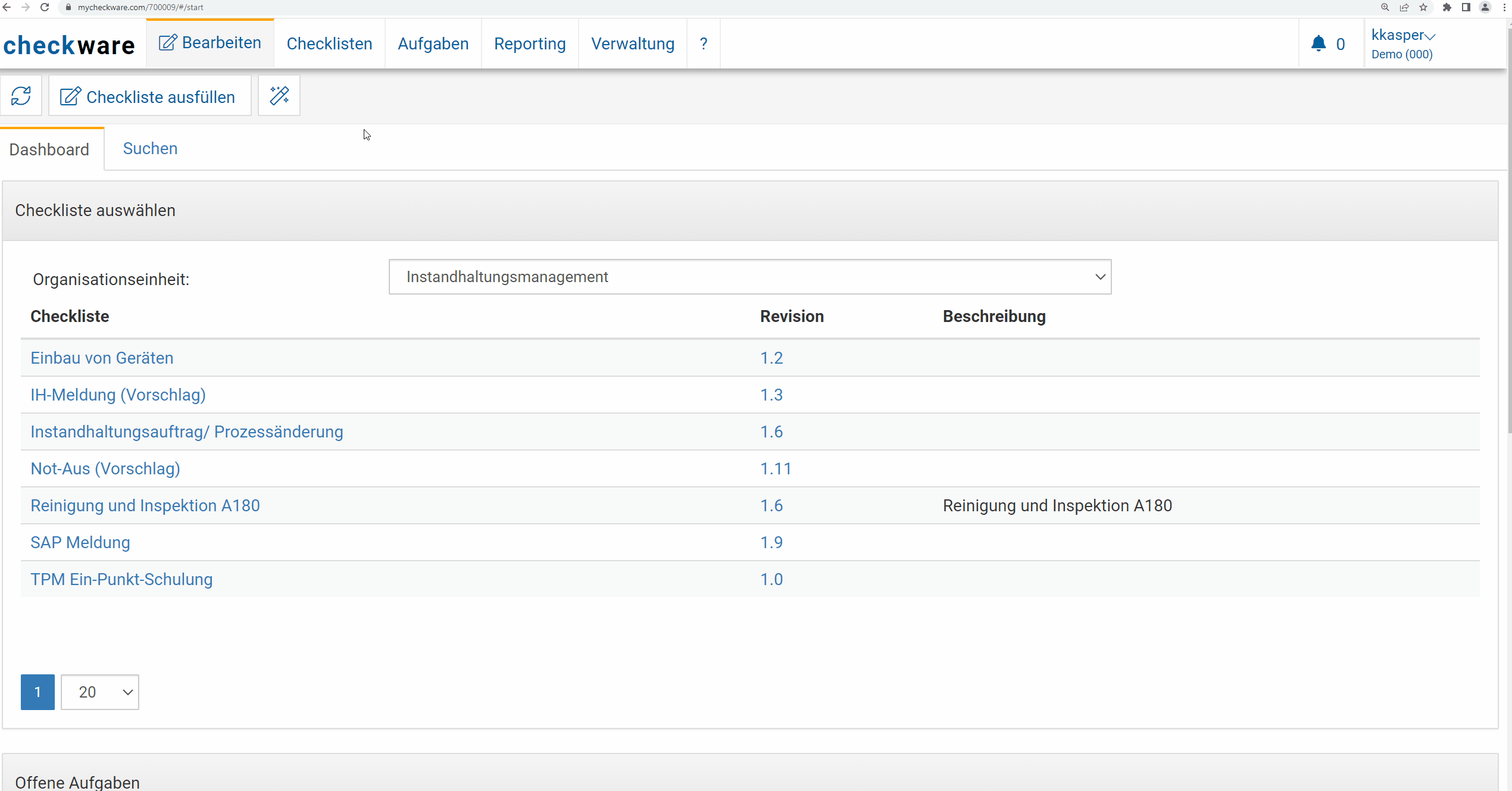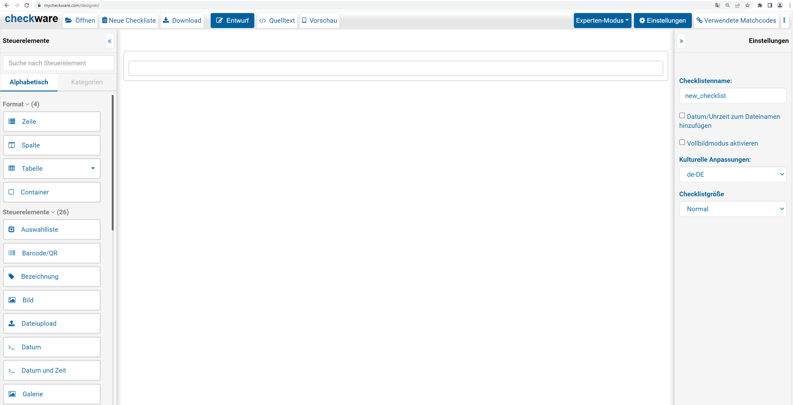 Ich öffne direkt über meinen Browser https://mycheckware.com/designer/ (alternativ https://myfinito.com/designer/, https://mysynoset.com/designer/, welcher spielt keine Rolle, da alle drei identisch sind) - Möglichkeit: Checklisten sind bereits auf meinem System aktiviert und es bestehen schon Vorlagen, die ich ändern möchte.Â