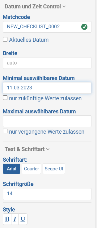 - Nur zukünftige Werte zulassen: Hier kann nur der heutige Tag und zukünftige Tage ausgewählt werden (Datum sobald die Checkliste geöffnet wird)