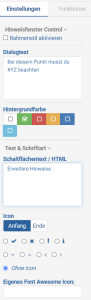 - Dialogtext: Das ist der Text der aufgeblendet werden soll. Beispielsweise eine Erklärung zu einem Punkt oder ein Hinweis auf was zu achten ist.