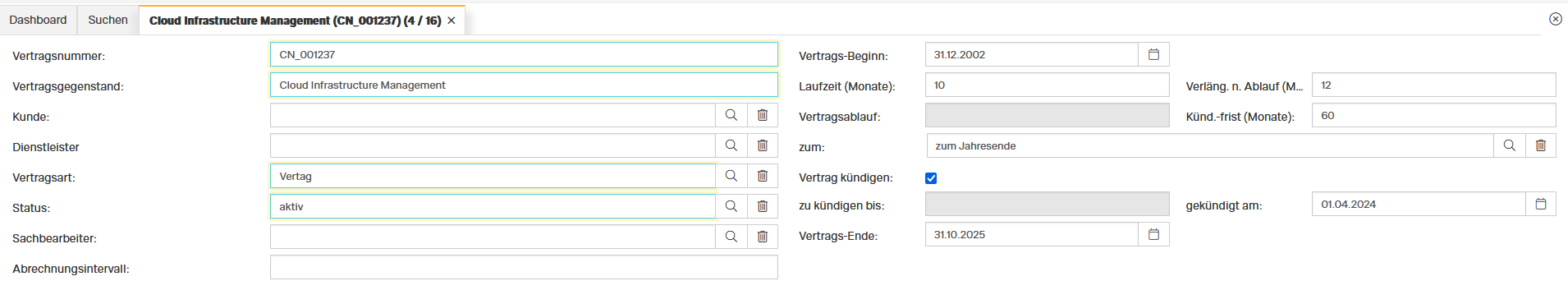 Auch hier sind die Pflichtfelder farblich markiert. Die Vertragslaufzeit, Kündigungsfrist und die dafür relevanten Daten stehen auf der Rechten Seite der Maske. Analog zu den Objektarten können auch Vertragsarten definiert werden. Der Status eines Vertrags ist ebenfalls analog zu den Objekten. An Verträgen können, ebenfalls analog zu den Objekten, diverse Reiter angefügt werden.