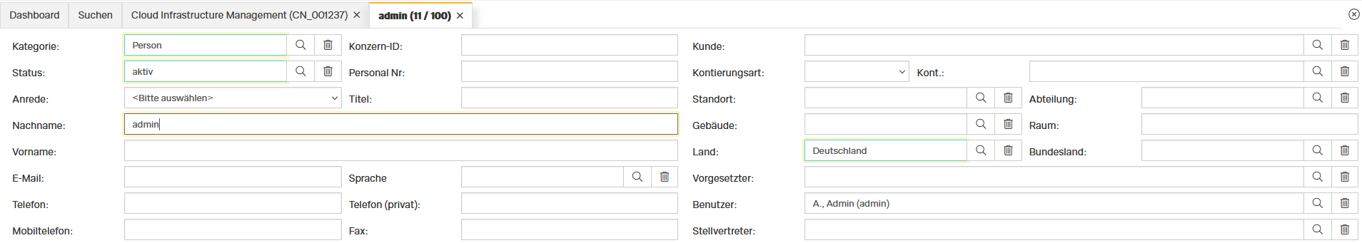 Pflichtfelder sind wieder farblich markiert. Neben den persönlichen Daten kann man hier auch Hierarchien angeben und Zugehörigkeiten angeben wenn eine Person eine Kontaktperson eines Kunden ist und Zugriff auf bestimmte Teile des Connected Workers benötigt. Weiter kann man auch hier Reiter einfügen die weitere Informationen beinhalten.