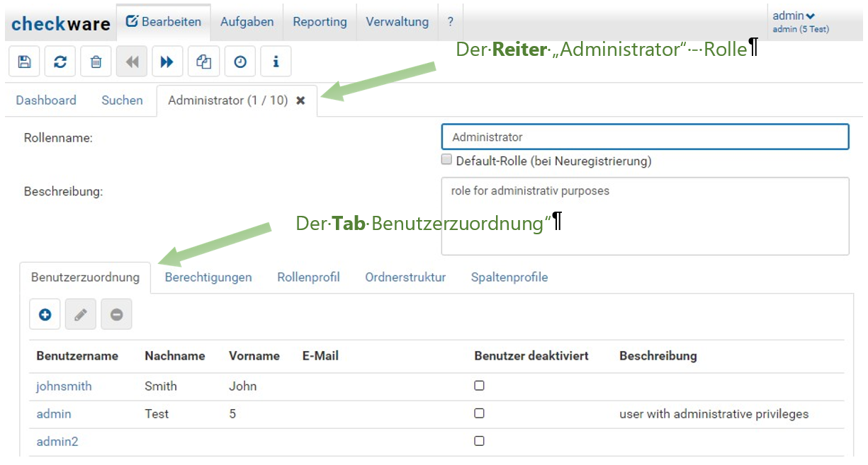 Abhängig davon, welche Berechtigungen vergeben sind, werden Menüs,