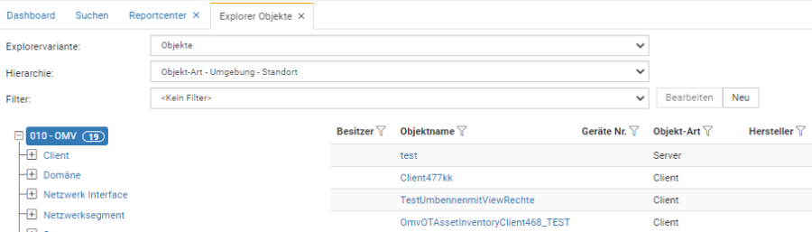 Die zweite Art, wie Sie nach Objekten suchen können, ist der Explorer. Der Explorer bietet Ihnen verschiedene Filtermöglichkeiten, die Sie kombinieren und speichern können, um unterschiedliche Suchanfragen zu erstellen bzw. die vorhandenen Objekte und so weiter nach unterschiedlichen Kriterien zu filtern und anzuzeigen.