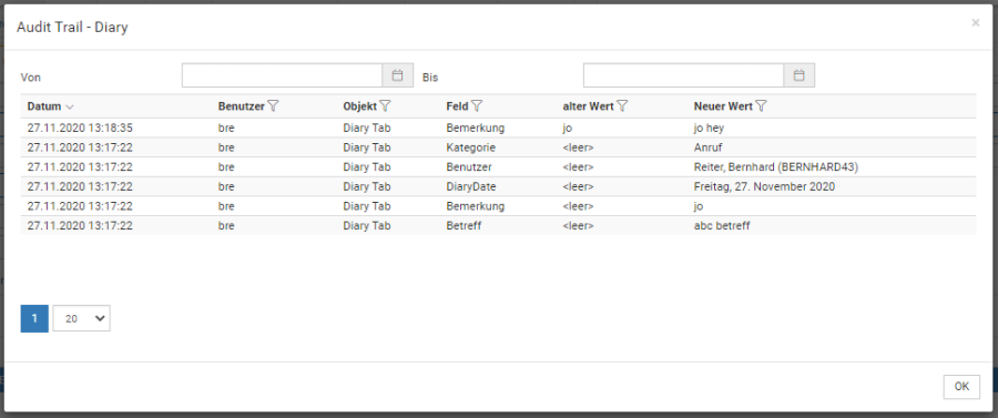 Der Audit Trail ist bei vielen Reitern und Tabs vorhanden. In ihm können die am Datensatz durchgeführten Änderung nachvollzogen werden.