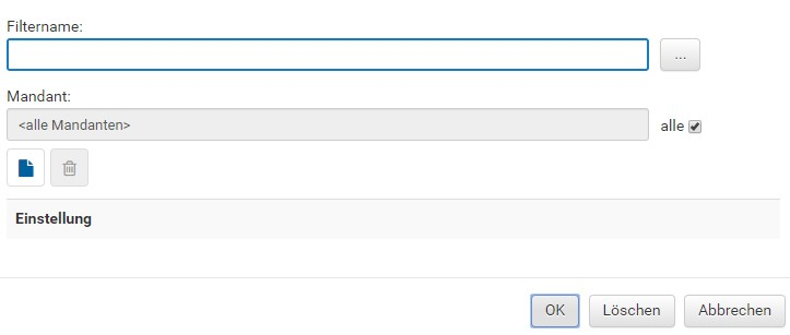 Der Filtername ist ein Pflichtfeld. Die Mandantenauswahl ist nur relevant, falls Ihre Organisation über mehrere Mandanten verfügt – die Standardeinstellung „alle" ist normalerweise ausreichend.