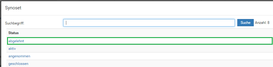 Im Tab „Status" kann über den Button Neu ein beliebiger bereits in Synoset gepflegter Status ergänzt werden. Hier öffnet sich folgender Suchdialog: