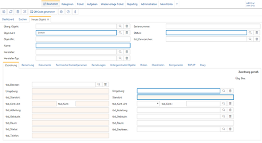 Je nach Objekt-Art werden unten unterschiedliche Tabs angezeigt. In diesen Tabs werden Objektdetails eingetragen, Zuordnungen gesetzt, Informationen zu Installation, Netzwerk oder Ansprechpartnern hinterlegt und vieles mehr.
