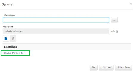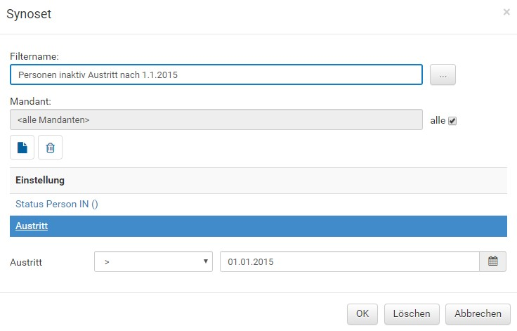 In diesem Bespiel werden alle Datensätze mit dem Status „inaktiv" angezeigt. Mit dem Button können weitere Optionen hinzugefügt werden, mit dem Button wird die gewählte Option entfernt.