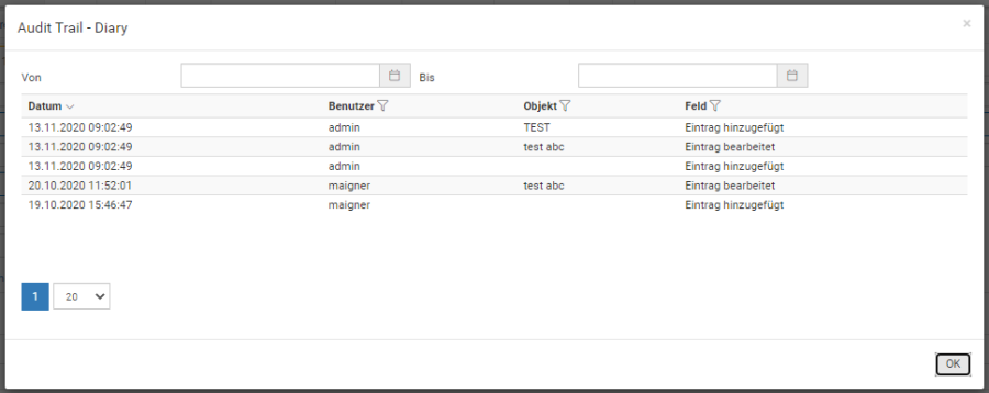 | Audit Trail | Dieser Button öffnet ein Fenster, in dem Sie alle Änderungen an den Daten des Objektes mit Datum, Uhrzeit, vorherigem Wert und Benutzernamen des Bearbeiters sehen können. | |