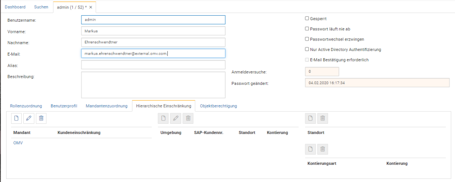 Die Hierarchische Einschränkung kann bei einem Benutzer eingerichtet werden, indem der gewünschte Datensatz über die Suche herausgesucht und geöffnet wird.