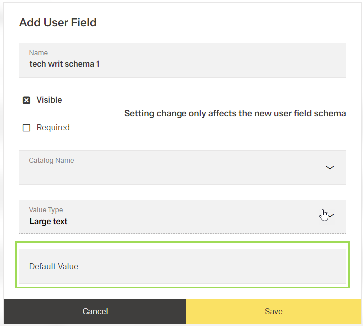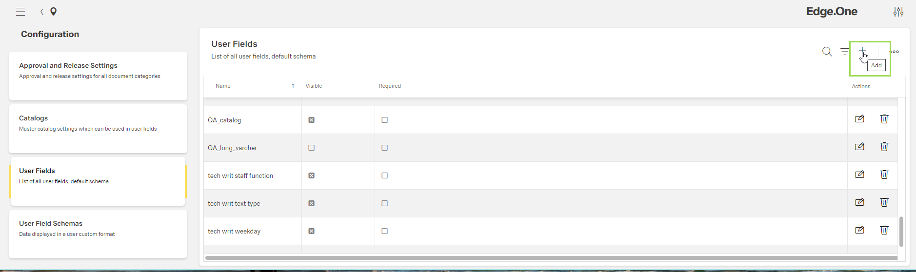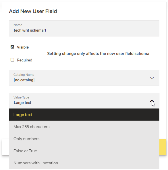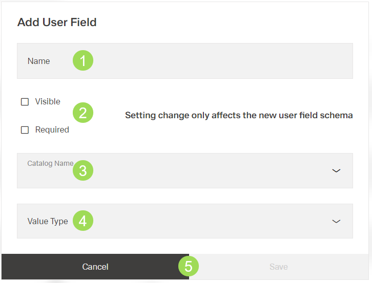 The illustration shows the dialog: (1) user field name*, (2) check boxes, (3) list with available catalogs, (4) data type* for the new user field (e.g. text, number), (5) buttons