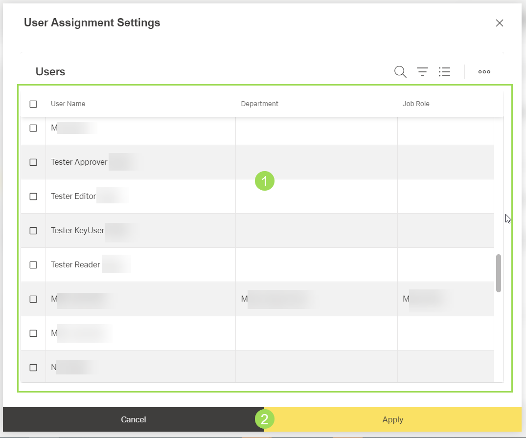 The illustration shows the selection of individual users: (1) list of users including checkboxes to select one or more users, (2) buttons