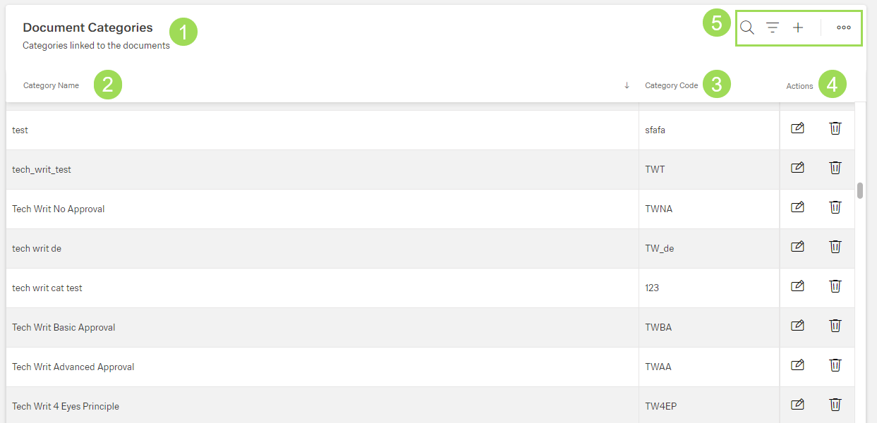 The illustration shows the start screen after opening "Categories": (1) menu name with short description, (2) column "Name", (3) column "Category Code", (4) column "Actions", (5) standard action buttons to sort and group the table