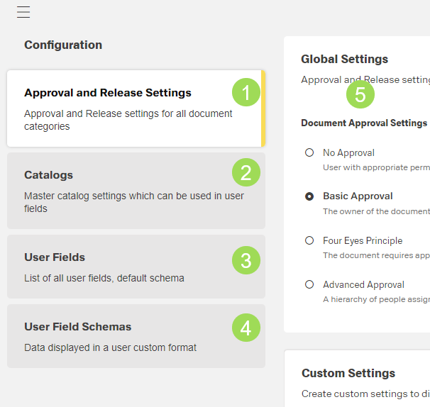 In this menu, the approval and release setting for documents are done. It is possible to set general settings and custom settings.
