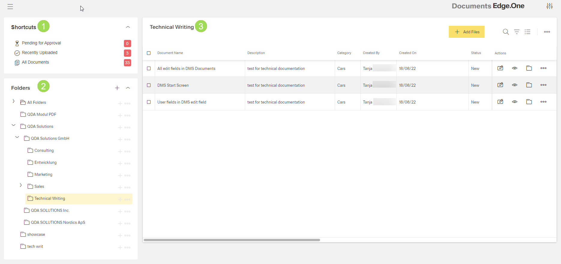 In this area of the screen, all documents contained in the selected folder are displayed. New documents can be added (button +Add Files). Already existing documents can be selected to perform actions according to the table: