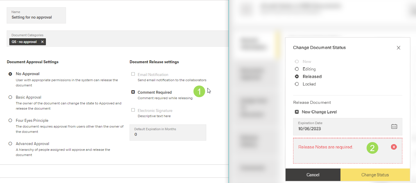 The illustration shows the release settings to the left <1> and the consequence in the document status change "Released" on the right.