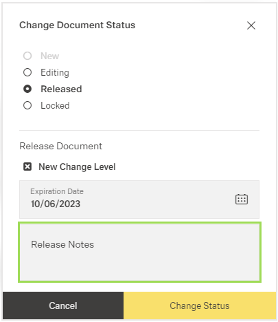 The illustration shows the document change dialogue for "Released" and the optional edit field "Release Notes" (green frame)