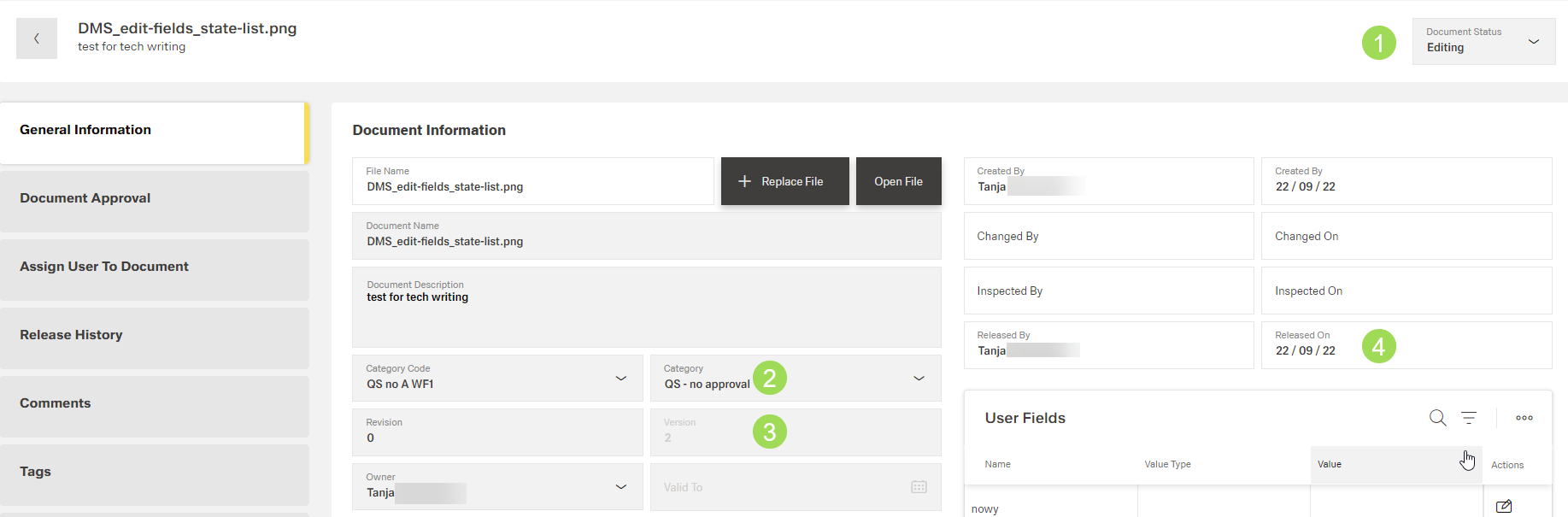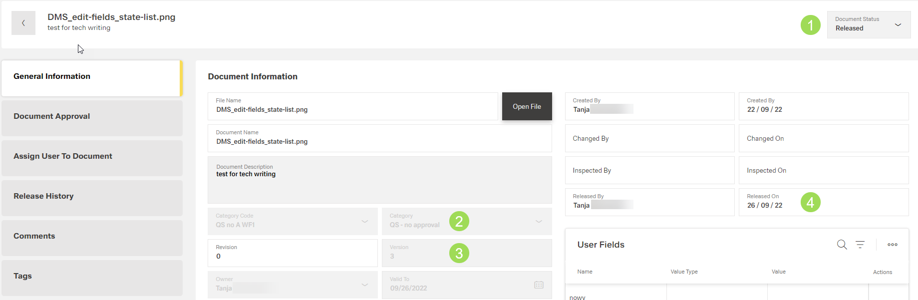 The illustration shows the document information after release: (1) document status dropdown, (2) category (now only as information, (3) information on updated actual document version, (4) updated latest release date