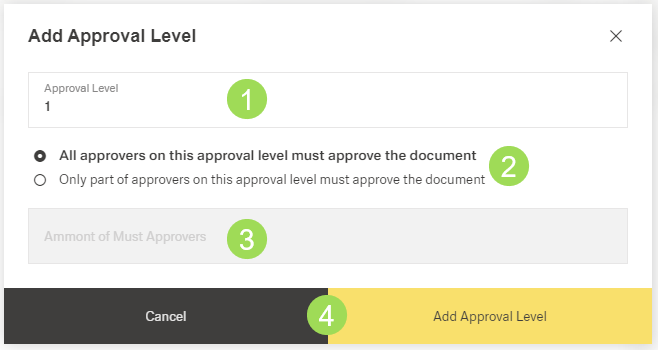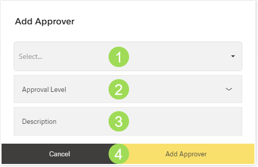 (1) dropdown list with possible approvers, (2) dropdown list with available approval levels, (3) optional edit field, (4) buttons