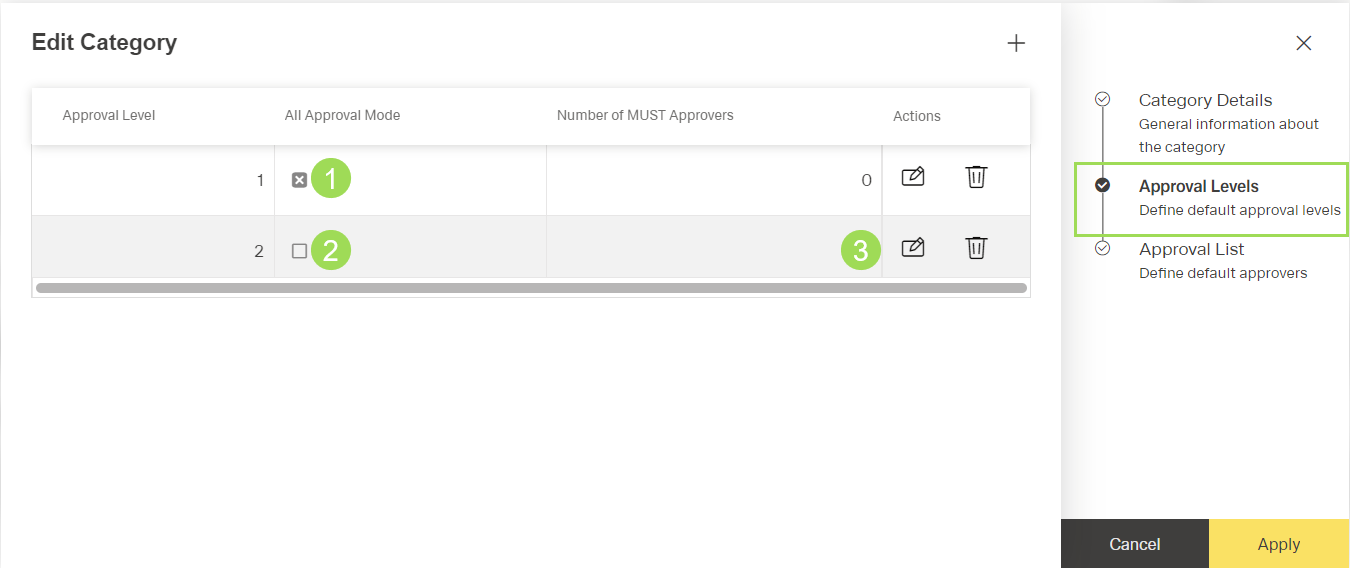 Click on "Approval Levels" <4> or the button Apply <7> to edit the approval levels