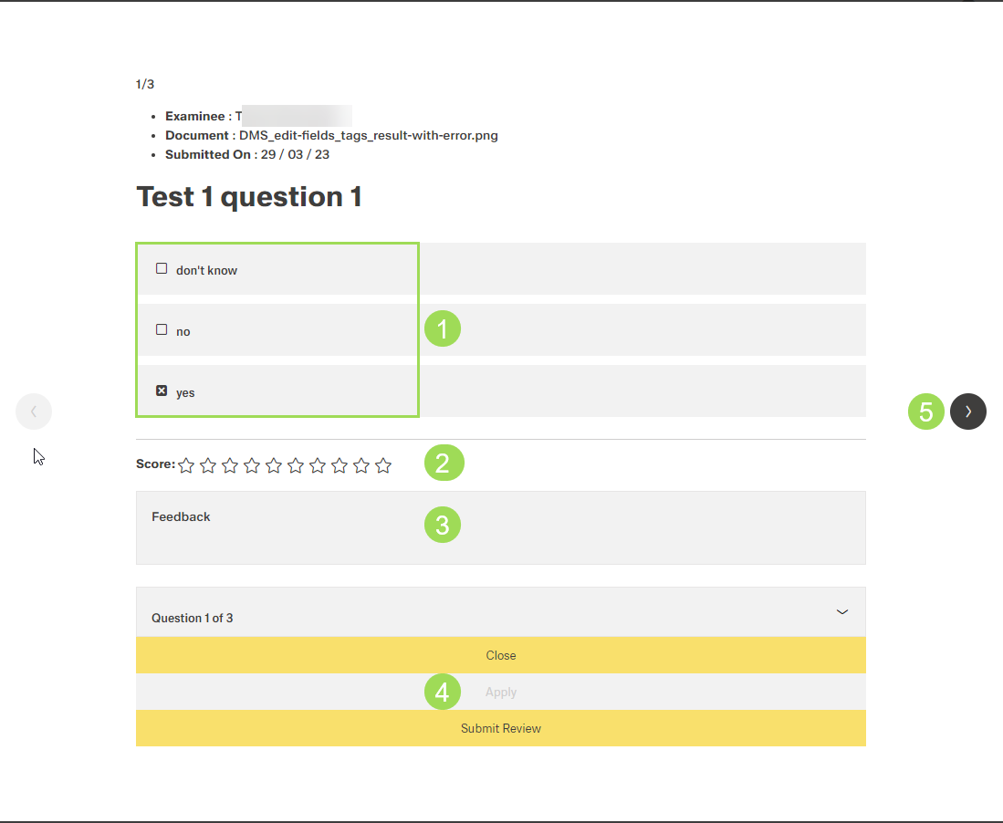 (1) answer(s) given by the examinee, (2) score for the answer(s): all stars white = fail, all stars black = correct, (3) optional individual feedback to this question, (4) buttons - button