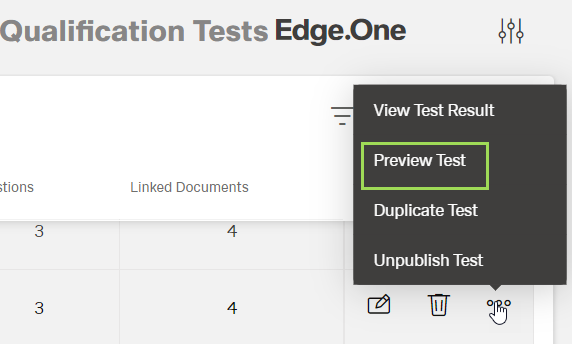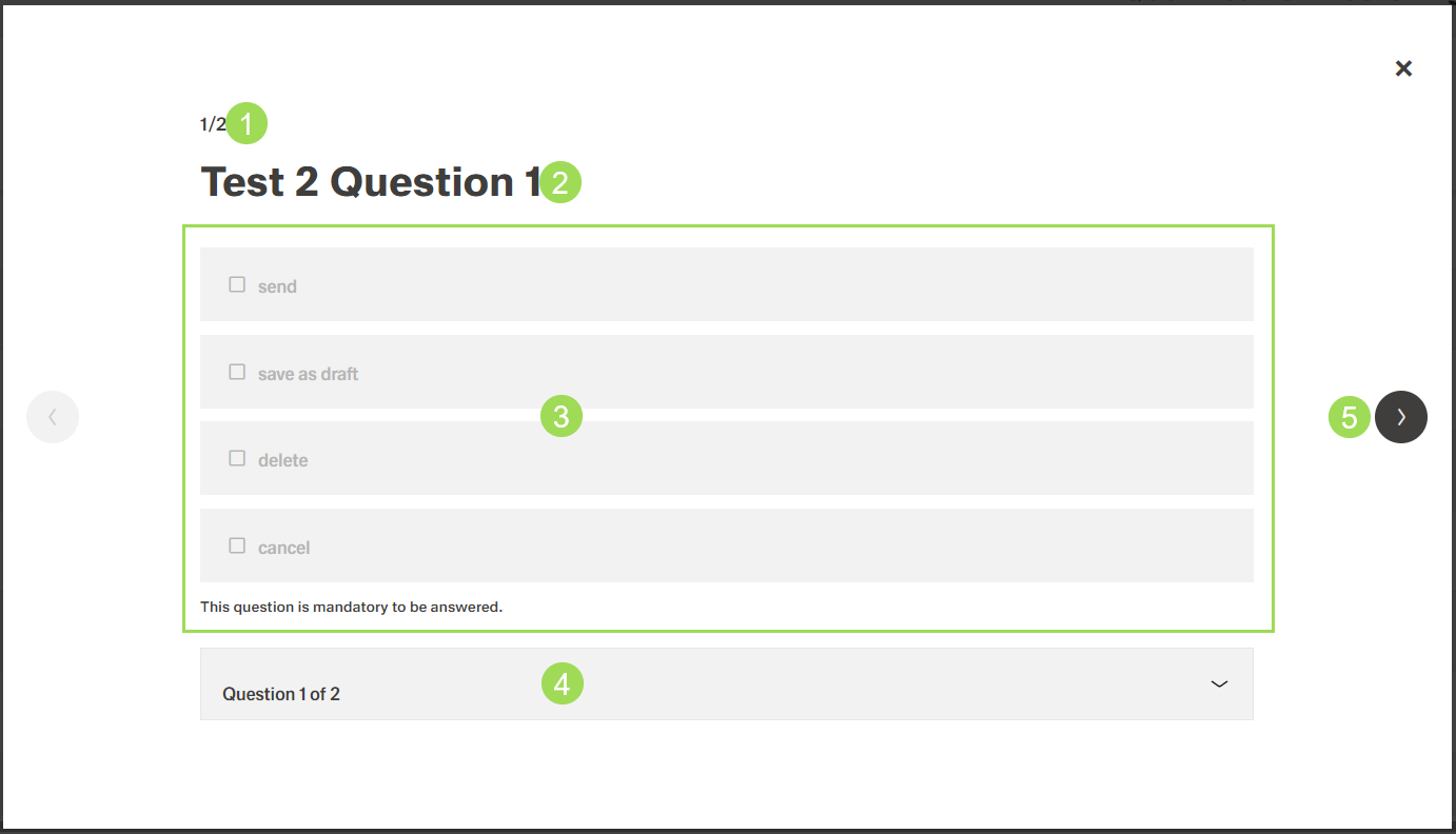 The illustration shows a preview: (1) information about current question of total no. of questions, (2) question name, (3) all available answers, (4) dropdown to directly select any question of the test, (5) next (and back on the other side)