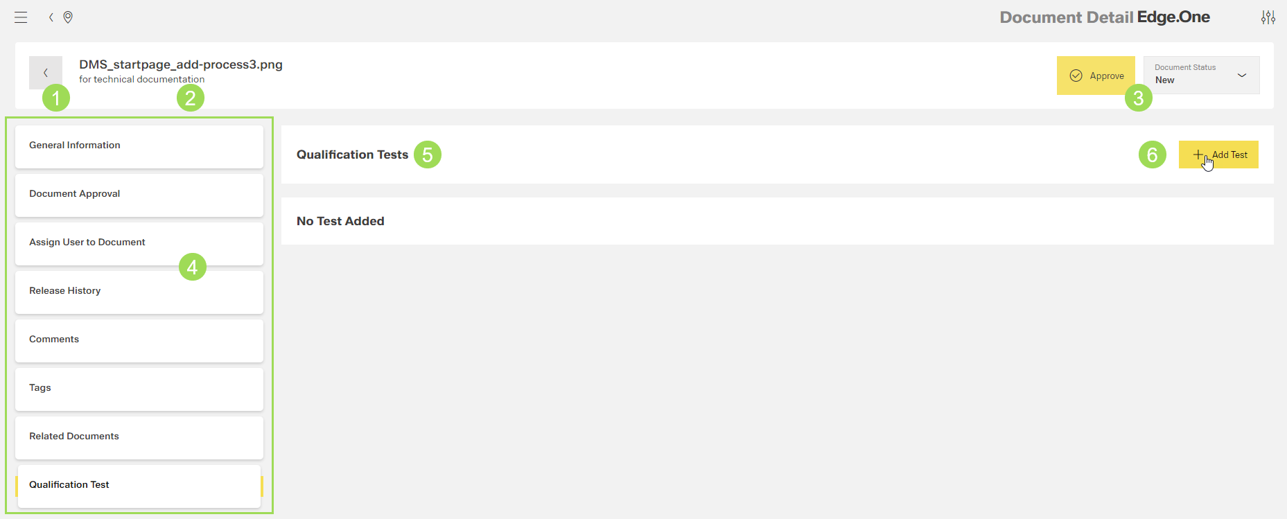 The illustration shows the submenu "Qualification Test": (1) header with document name and information, (2) main submenu bar, (3) document status, (5) list with assigned qualification tests, (6) button to assign a a qualification test to the document