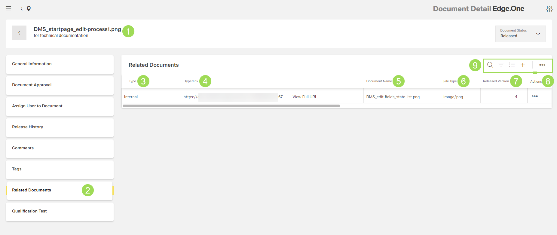 The illustration shows the submenu "Related Documents" with a linked document: (1) header with document name and information, (2) main submenu bar, (3) column "Type", (4) column "Hyperlink", (5) column "Document Name", (6) column "File Type", (7) column "Released Version", (8) column "Actions", (9) standard action buttons to sort and group the table