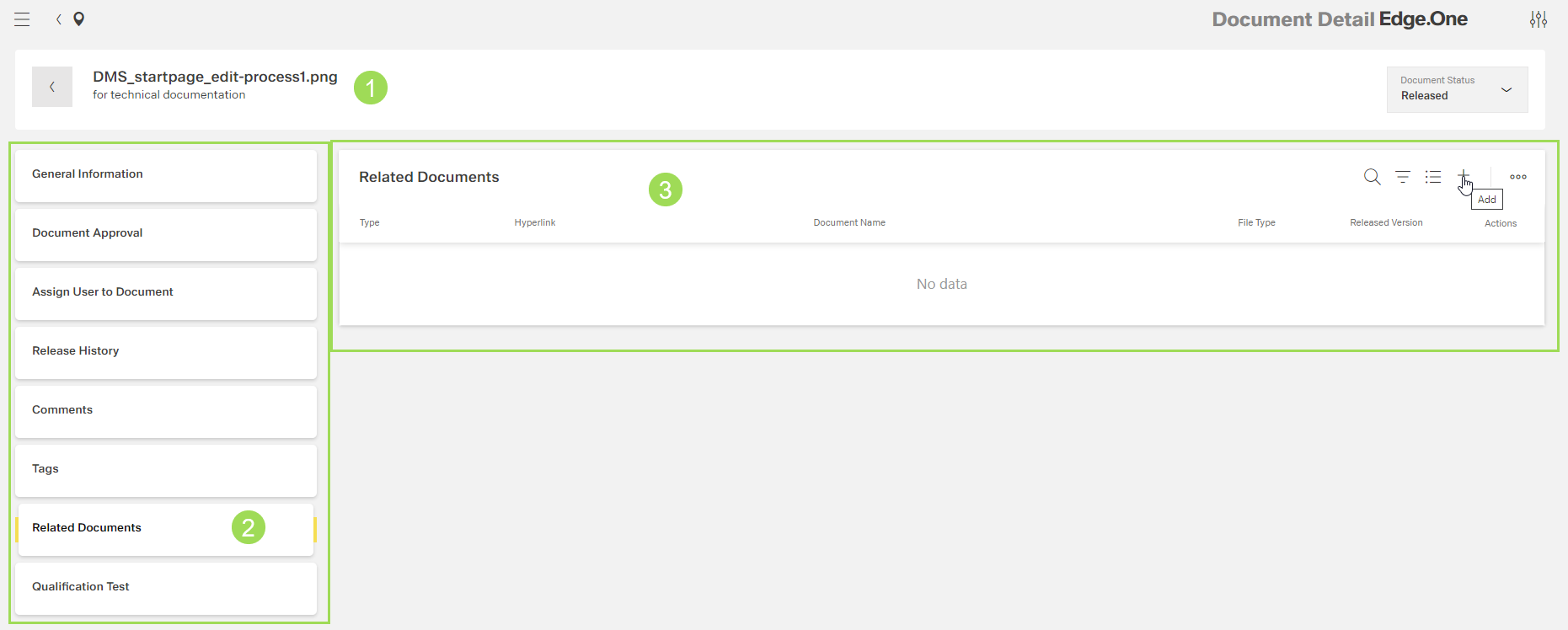 The illustration shows the submenu "Related Documents" without a linked document: (1) header with document name and information, (2) main submenu bar, (3) table for related document(s)