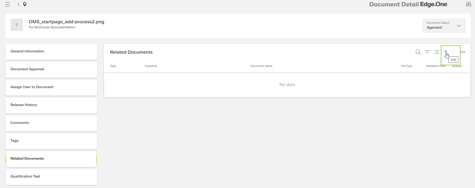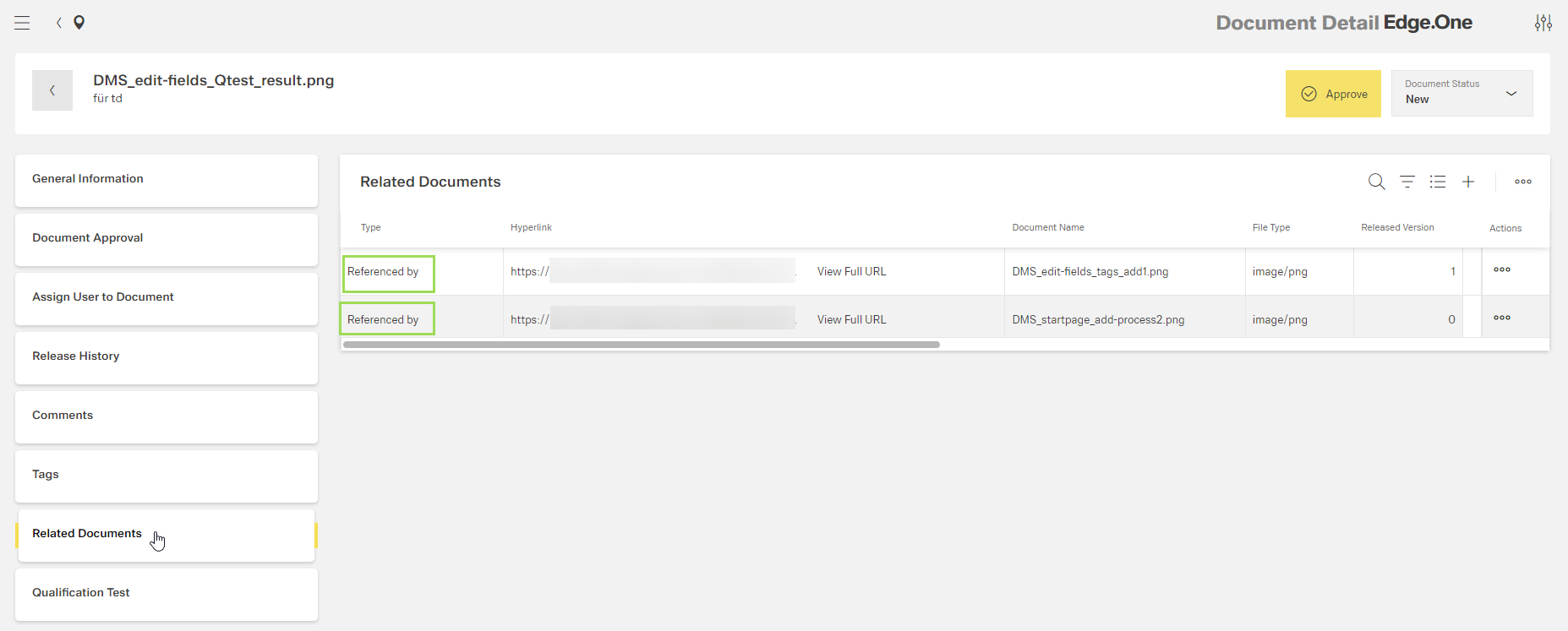 Internally linked documents are linked "from both sides": Both documents have the respective related document listed under "Related Documents".