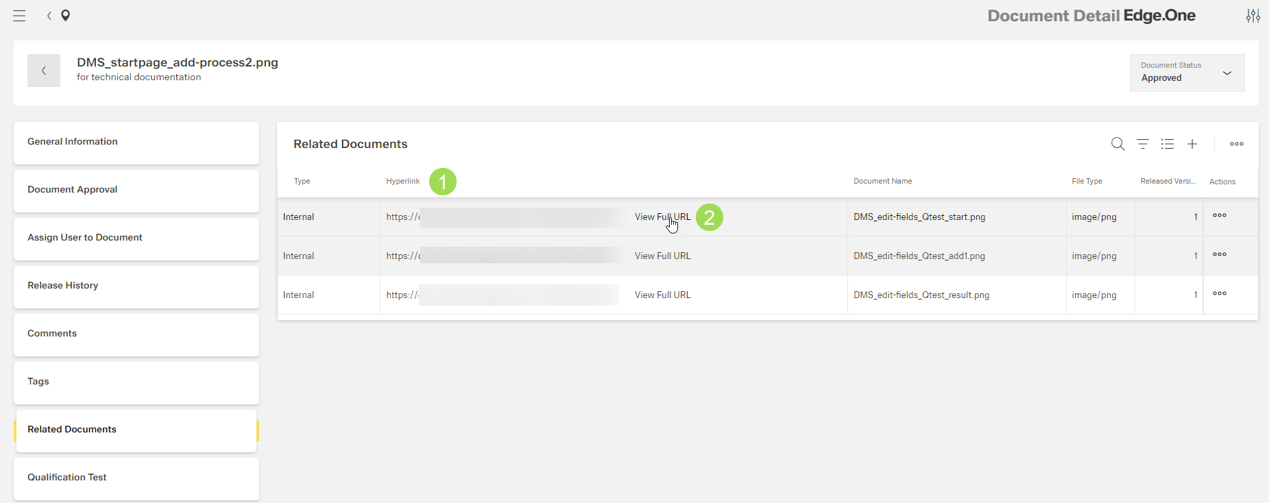The illustration shows the newly linked related document: (1) Hyperlink shows where the related document is stored, (2) link to expand the hyperlink; the other columns give information in the linked document.