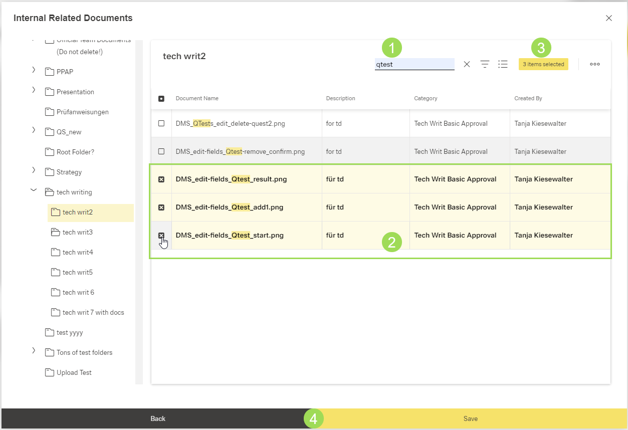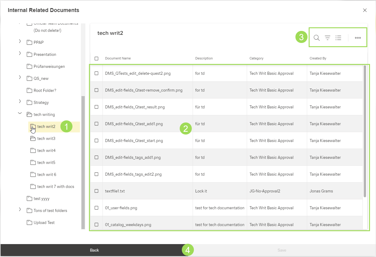 (1) selected folder, (2) docs to be selected, (3) standard action buttons to sort and group the table, (4) buttons